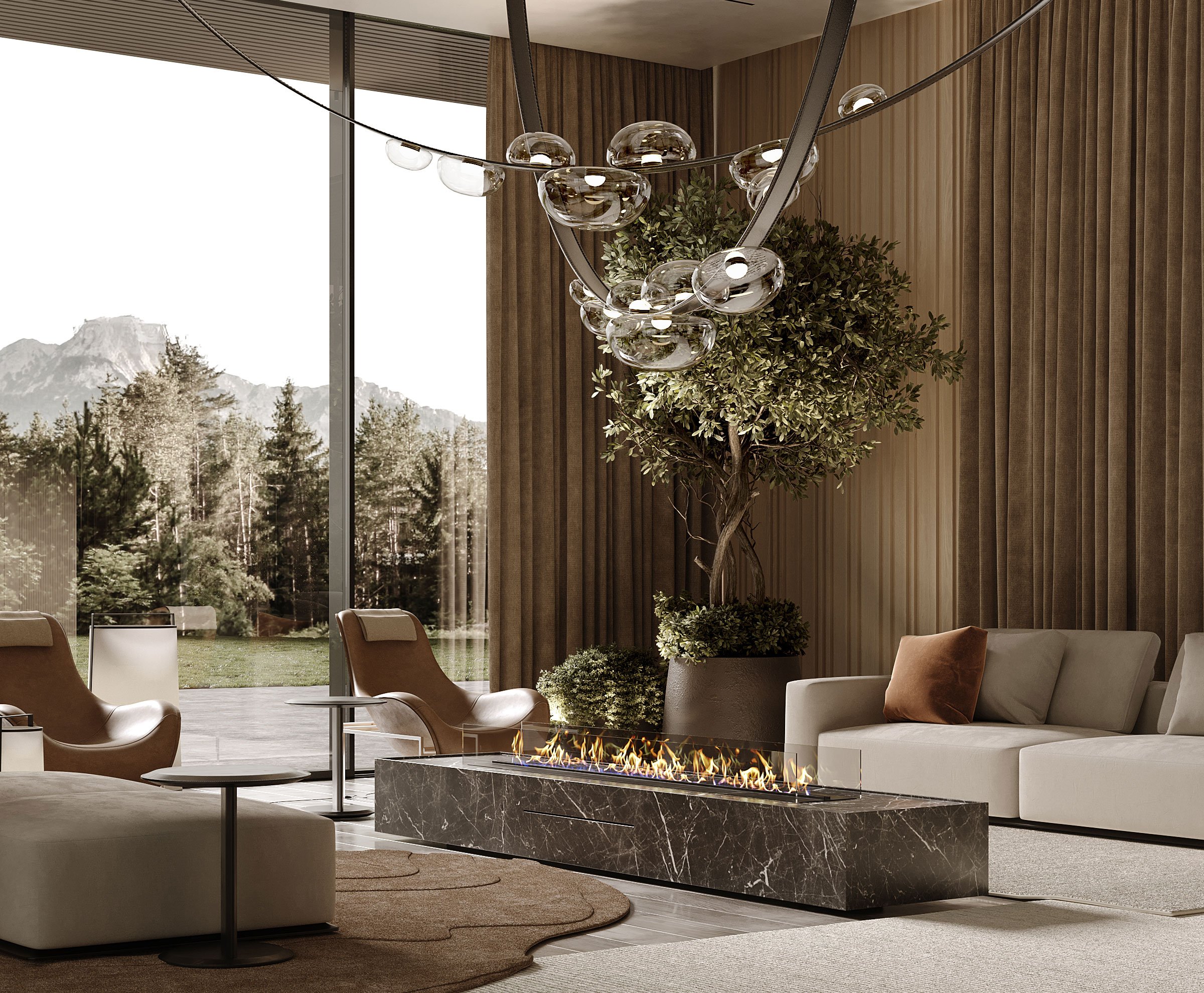 — Зона отдыха с мягкой мебелью: В центре этой зоны находится камин-очаг прямоугольной формы, который служит не только источником тепла, но и фокусным элементом интерьера. Уют и комфорт создают мягкие диваны и кресла, приглашающие к отдыху и расслаблению. Панорамное окно с видом на горы добавляет натурального света и природной красоты в пространство.