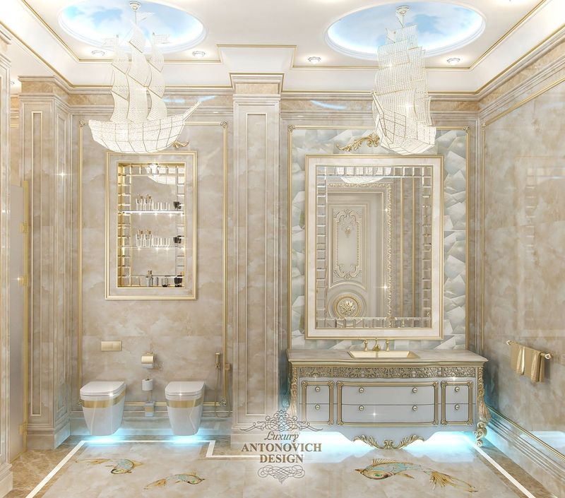 Дизайны ванных комнат стали лаконичными продолжениями спальни и детской. Ванная возле детской продолжает мотивы сказки с помощью красивого декора полов из мрамора с узорами в виде сказочных рыб. А потолок украсили две симметричные люстры в виде летящих кораблей их хрусталя. А ванная возле родительской спальни стала роскошным оазисом с красивой мебелью, блеском золота и переливами мрамора.
