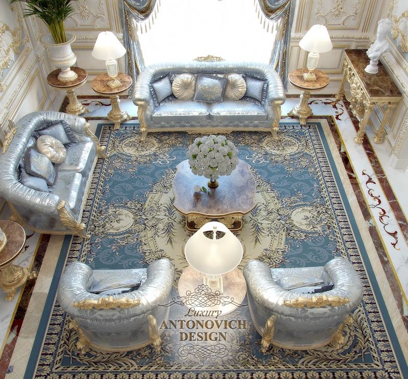 Эпицентром красоты в интерьере квартиры стала гостиная, от которой отталкиваются в своем концептуальном решении остальные комнаты квартиры. Преобладающим оттенков в палитре интерьера стал нежно-голубой. Это было одни из пожеланий клиентов, поскольку именно этот оттенок является их любимым цветом. Гостиную украсила красивая итальянская мебель с округлыми формами. Нарядный декор полов, стен и потолка задает определенное настроение в интерьере с торжественными и праздничными нотками. Живописно смотрится натуральный ковер с классическими орнаментами.