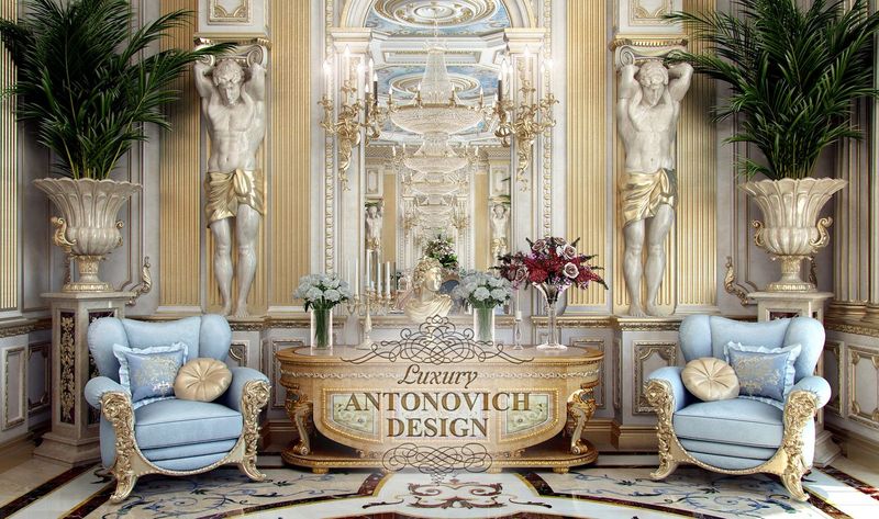 Красивый холл стал частью гостиной. Наиболее пышным и нарядным дизайнер интерьера предложила сделать декор стен. Здесь во всей своей прелести главенствует прекрасное рококо с пышным лепным декором и скульптурными композициями в виде Атлантов. Настоящей жемчужиной интерьера стала мебель, которая инкрустирована резным декором ручной работы и позолотой. Такие очаровательные аксессуары как декоративные вазы из мрамора с живыми растениями прекрасно дополнили теплотой природы интерьер. С помощью зеркал автор проекта усиливает нарядное настроение интерьера.