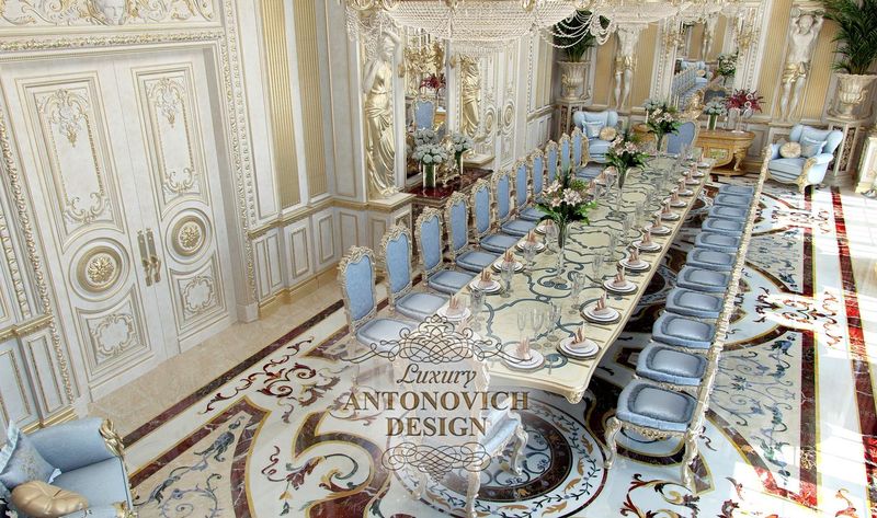 Большая площадь квартиры позволила реализовать одну мечту ее владельца, которая заключалась в наличии большой столовой. Большая часть гостиной принадлежит именно этому пространству, где с комфортом могут разместиться 24 персоны. Большой окружают красивые мягкие стулья с резьбой и обивкой из плотного шелка. Резной пол из мрамора с авторскими орнаментами можно смело сравнить с картиной художника. На этом живописном полотне красиво сочетаются разные породы натурального мрамора.