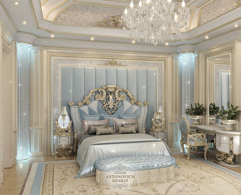 Если в интерьере гостиной, столовой и холла царит торжественное и праздничное настроение, то в интерьере спальни присутствуют приятные романтичные нотки расслабленности и спокойствия. Та же нежно-голубая палитра оттенков здесь выглядит более сдержанно и лаконично. Светлана Антонович изящно импровизирует с элементами освещения. Оригинальные светильники с хрустальными подвесками на всю высоту помещения украсили два угла по бокам кровати. Наряду с большой хрустальной люстрой освещение интерьера дополняют маленькие потолочные светильники.