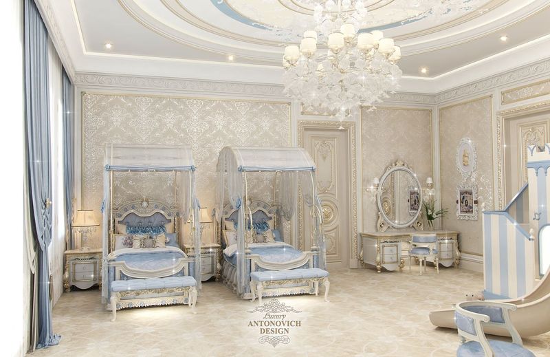 Детская спальня с игровой зоной наполнена чистой радостью и счастливыми эмоциями. Дизайнер интерьера демонстрирует как с помощью одной палитры оттенков можно создавать разные настроения и образы. Это удается с помощью прекрасных импровизаций с элементами декора и освещением. Продумана каждая деталь, чтобы все члены семьи чувствовали себя абсолютно комфортно. Для детской в декоре полов прекрасно подошёл паркет из светлого дерева ценной породы. Красивая мебель, благородный декор стен и потолка вполне соответствуют общей дизайн концепции 4-х комнатной квартиры площадью 180м2 в ЖК Байсанат.