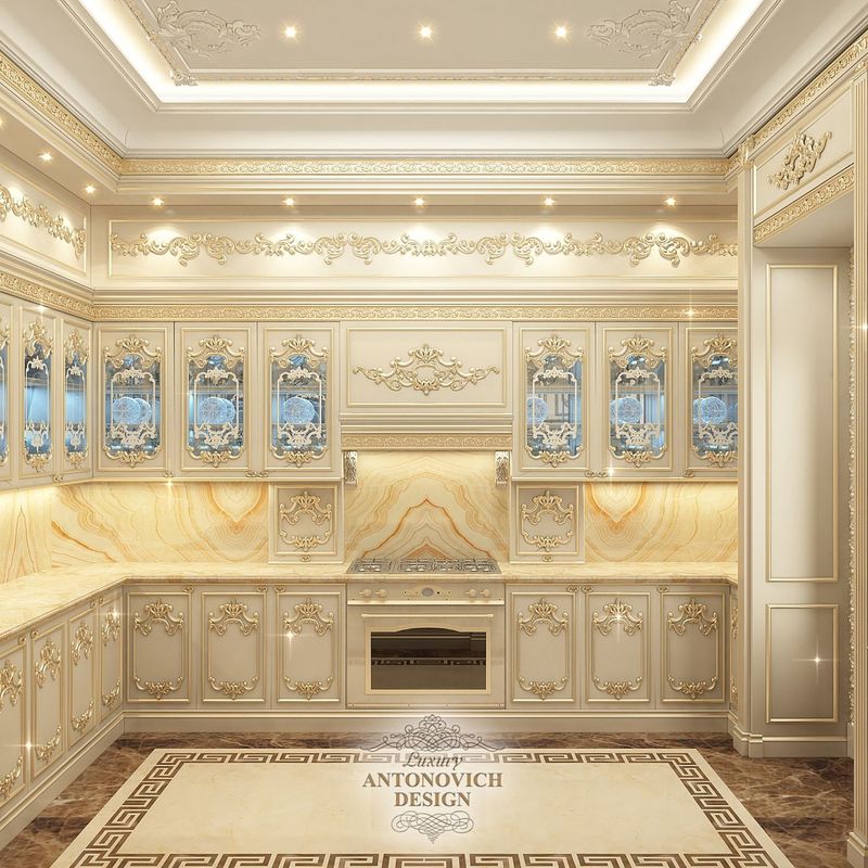 Дизайн кухни отличается отличной эргономикой пространства и красивыми чертами. Фасады кухонной мебели, за которыми скрываются новейшие системы хранения, украшены резным декором с элементами позолоты. Рабочий фартук из натурального оникса еще раз подтверждает элитный статус этого интерьера. Чтобы визуально сделать помещение больше, дизайнер импровизирует с геометрическими орнаментами на мраморном полу и декором потолка. Многоуровневая ниша с подсветкой и красивым молдингом визуально увеличивает высоту помещения.