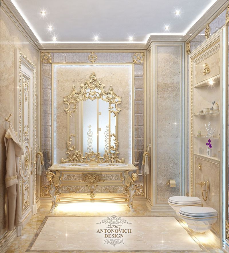 Дизайны ванных комнат стали лаконичными продолжениями спальни и детской. Ванная возле детской продолжает мотивы сказки с помощью красивого декора полов из мрамора с узорами в виде сказочных рыб. А потолок украсили две симметричные люстры в виде летящих кораблей их хрусталя. А ванная возле родительской спальни стала роскошным оазисом с красивой мебелью, блеском золота и переливами мрамора.