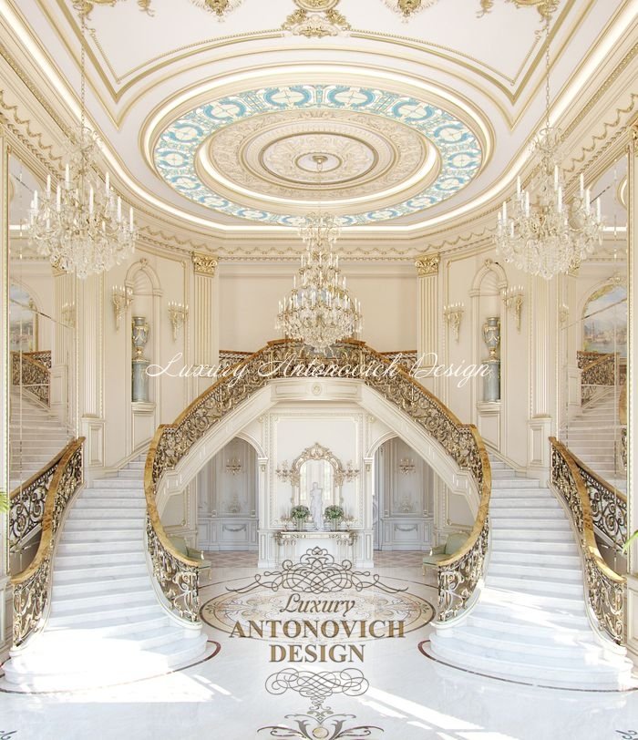 Роскошное пространство украсила двойная мраморная лестница с красивой кованой балюстрадой и мраморными перилами. Высокие окна пропускают достаточное количество дневного света. Благодаря этому светлый мрамор лестницы и полов с резными узорами играет во всей своей красоте. Интерьер величественно и аристократично «расправляет плечи» и настраивает с первых секунд пребывания в доме на правильное восприятие пространства. Лестница олицетворяет подъем к успеху и счастью. Эту композицию венчает потолок с художественной росписью в духе картин великого Рафаэля. Ниши с большими вазами, пилястры с лепными капителями и картины художников. Все это прекрасные атрибуты декора стен.