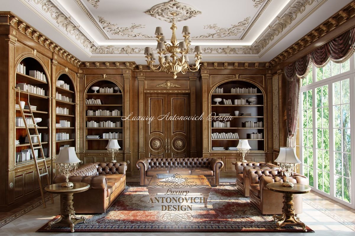 Еще одной особенностью дизайн проекта дома в классическом стиле стало оформление большой домашней библиотеки. Мягкие диваны обиты натуральной кожей. Мебель из натурального дерева ценной породы инкрустирована резным декором с позолотой. Потолок украшает пышный лепной декор. Идеальная организация пространства и большие окна будут всегда способствовать комфортному времяпрепровождению за чтением любимых книг.