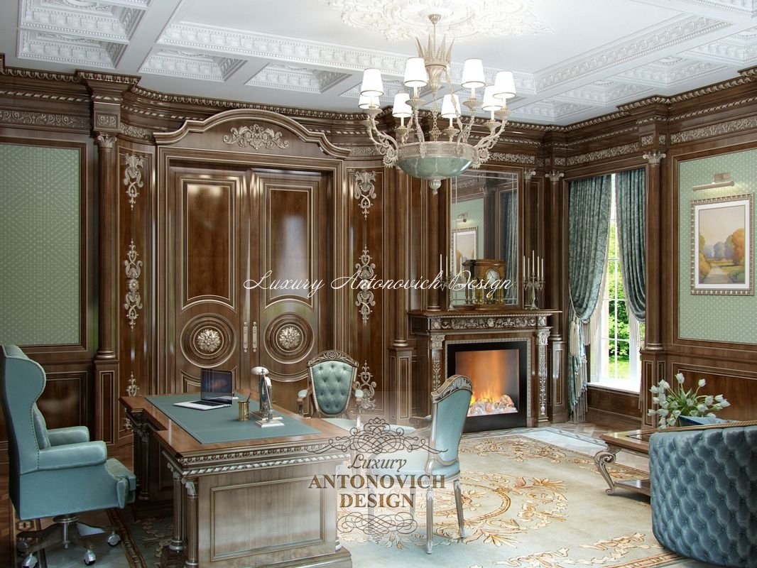 Дополняют резиденцию такие комнаты как библиотека, рабочий кабинет, комната для чаепитий, несколько спален, роскошная кухня, большая столовая и другие необходимые для комфортной жизни помещения. О каждой из них мы расскажем подробно в отдельных статьях. А сейчас давайте остановимся и заглянем в респектабельный рабочий кабинет главы семьи. Согласитесь, именно в таких кабинетах вершится история мира и рождаются гениальные идеи. Классическое сочетание изумрудного цвета и коричневого дерева придает комнате одновременно уютный и деловой вид. Особенностью помещения стало наличие нескольких больших окон. Таким образом, пространство рабочего кабинета стало более открытым и наполненным светом. Натуральный паркет, мягкий ковер и уголок с мягкой мебелью призваны дарить уютные моменты отдыха, которые так важны для эффективной работы.