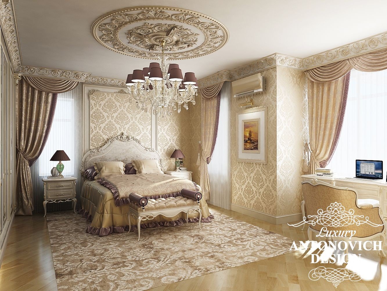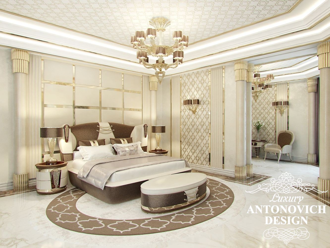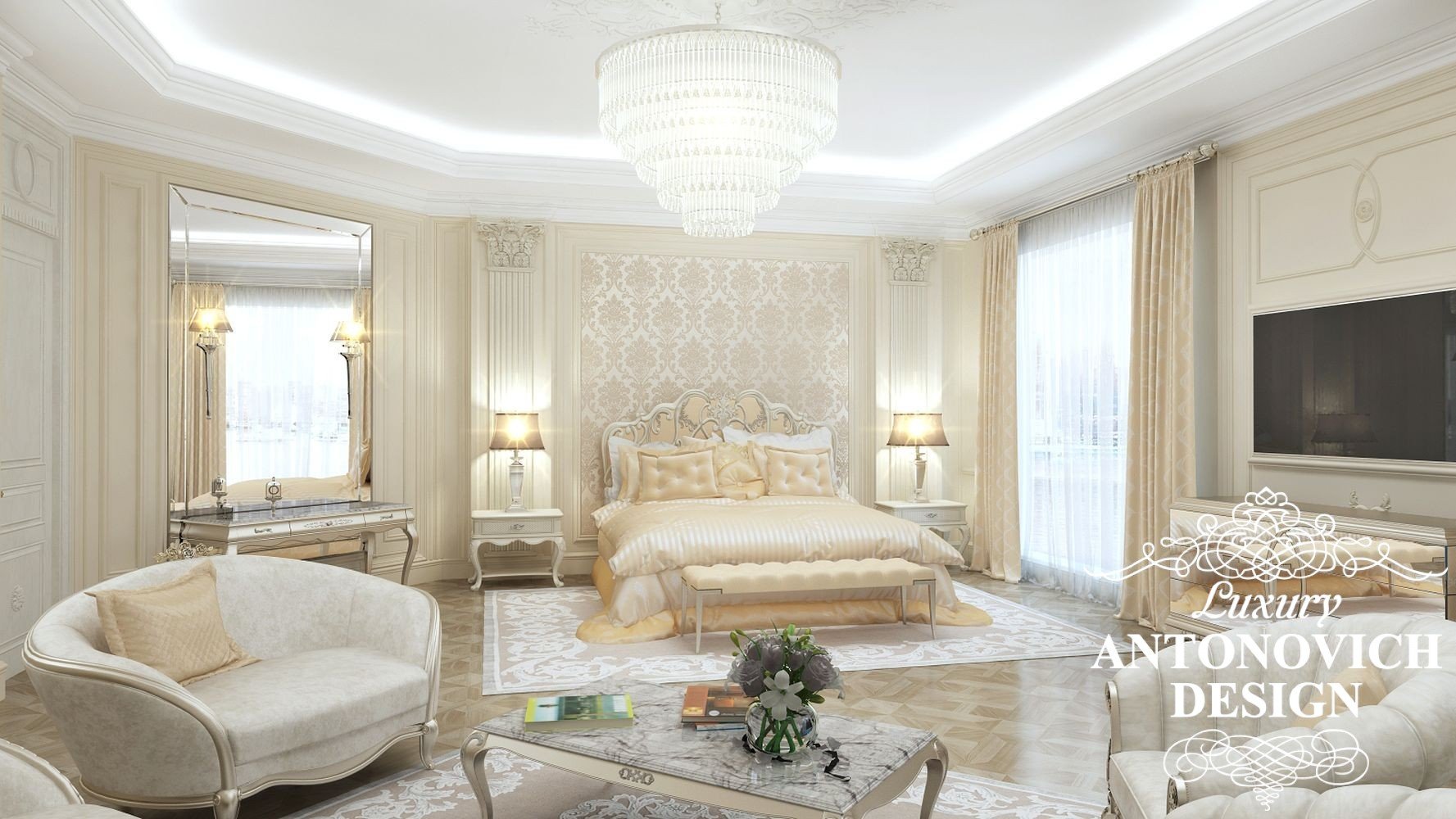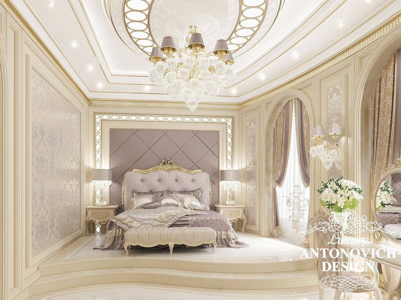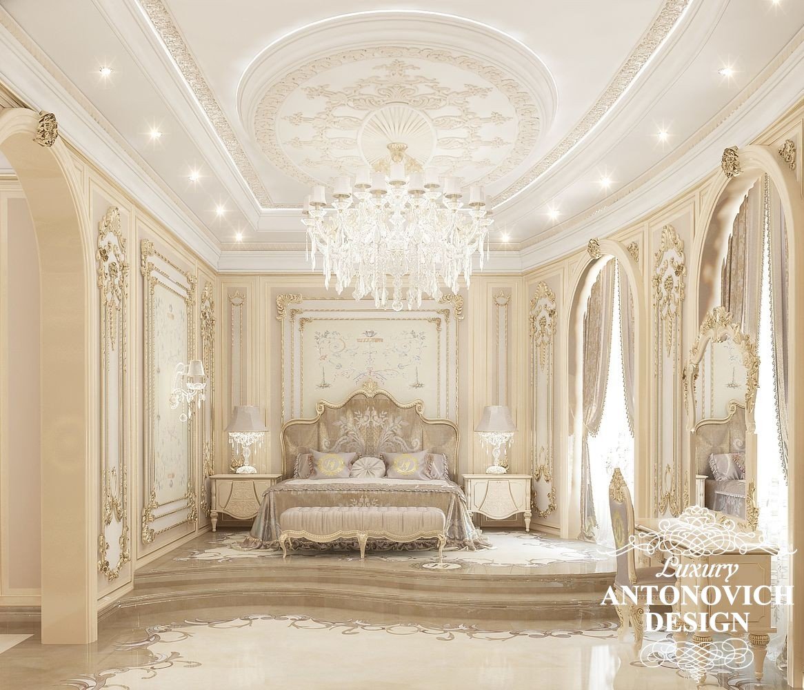 Благородный и элегантный образ интерьера спальни можно подчеркнуть такими деталями как элитные обои с дамасским орнаментом, роскошными шторами и текстильной панелью. Чтобы создать еще более возвышенный и вдохновляющий образ, кровать можно приподнять на невысокий подиум с мраморными ступенями.
