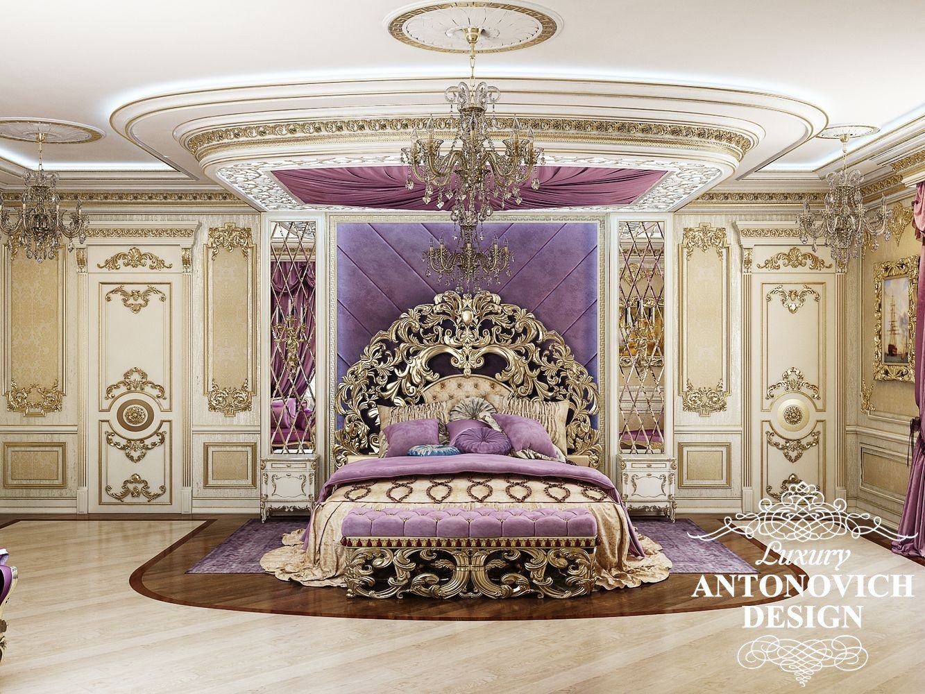 Для интерьера спальни в дворцовом стиле идеально подойдет кровать с высоким резным изголовьем, которое покрыто позолотой, а также декор потолка с балдахином из шелка.