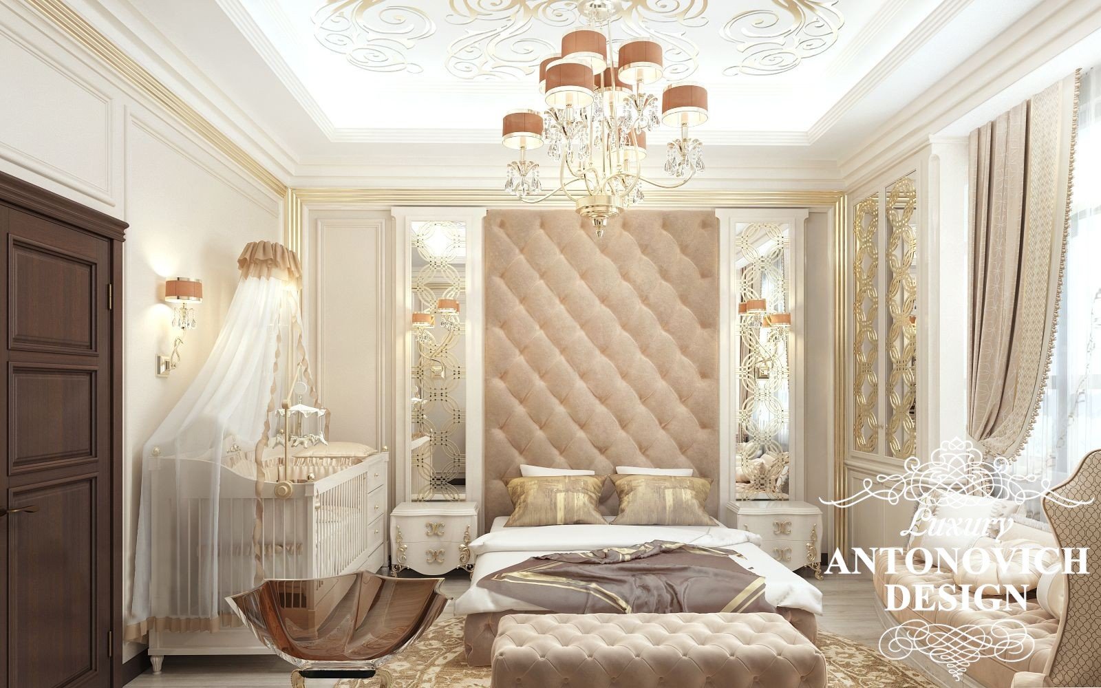 Интерьер спальни можно дополнить кроваткой для малыша параллельно кровати. Чтобы в первый год жизни ребенка быть всегда рядом и дарить свою любовь.