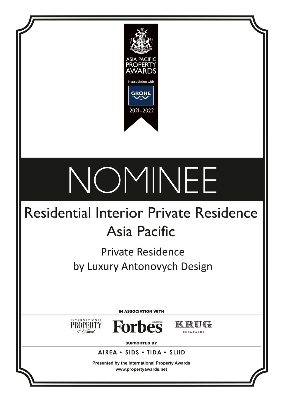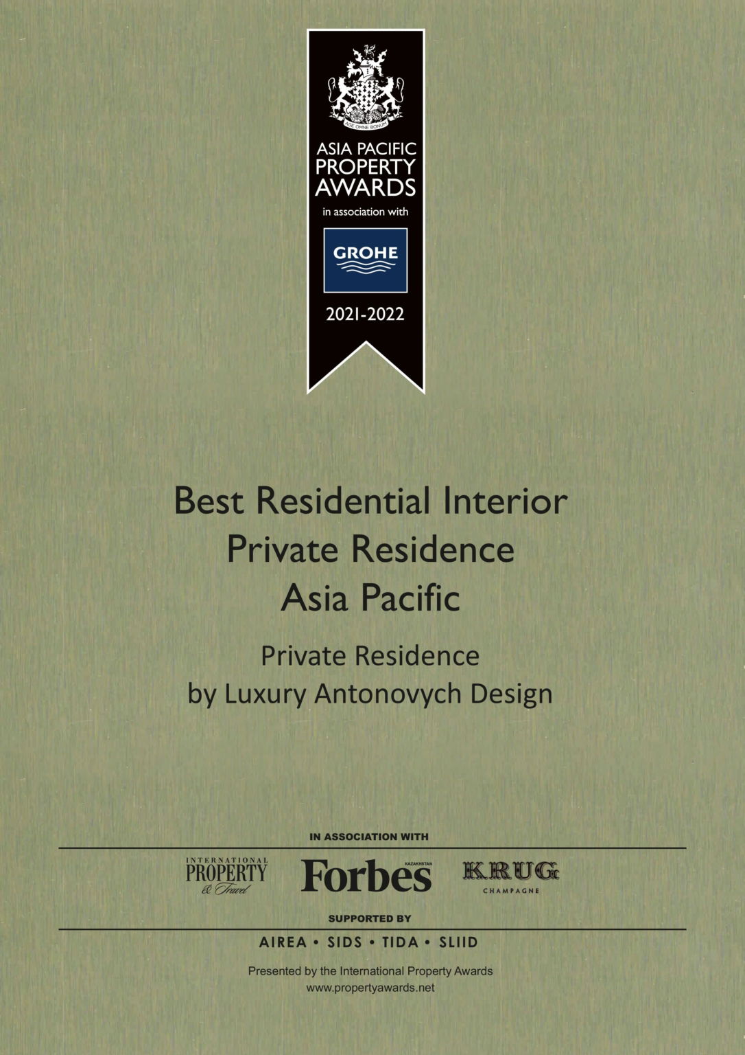 Победа Antonovych Design на Asia Pacific Property Awards 2021-2022 — это признание высочайшего уровня достижений компании, работающей в сфере дизайна интерьеров. Премия International Property Award — это всемирно известный знак качества.