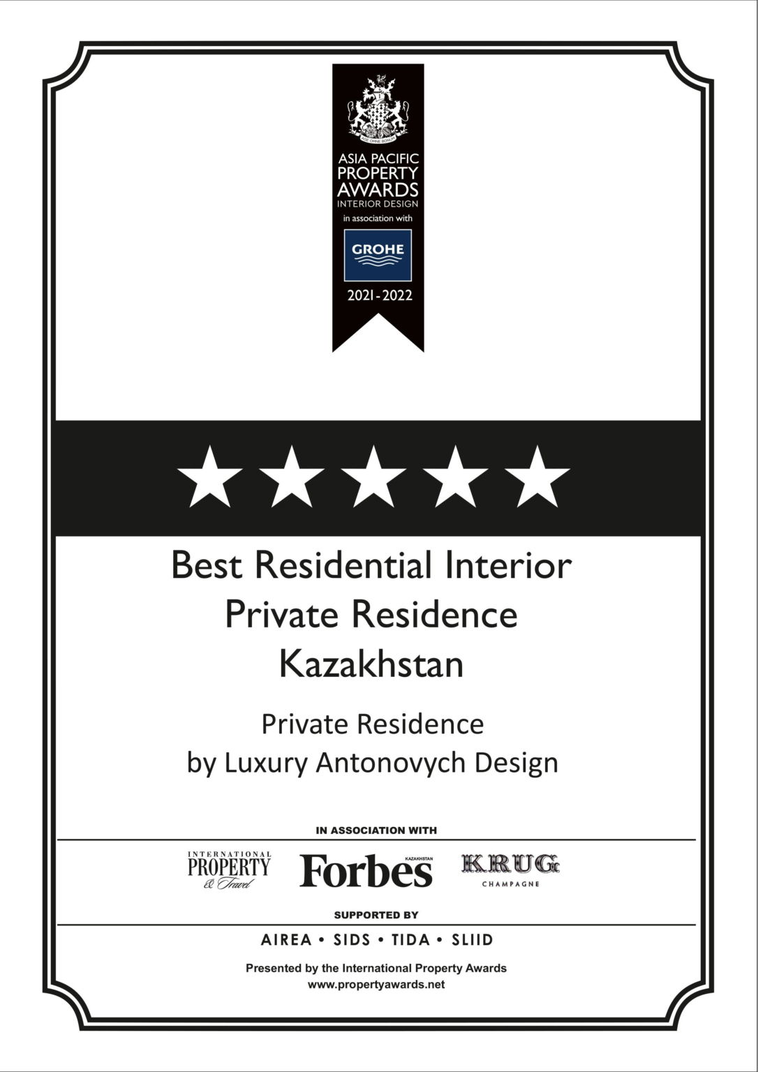 Студия Antonovych Design стала победителем конкурса International Property Awards 2022-21: Asia Pacific в номинации 5 звезд, Best Residential Interior Private Residence Kazakhstan, Private Residence.