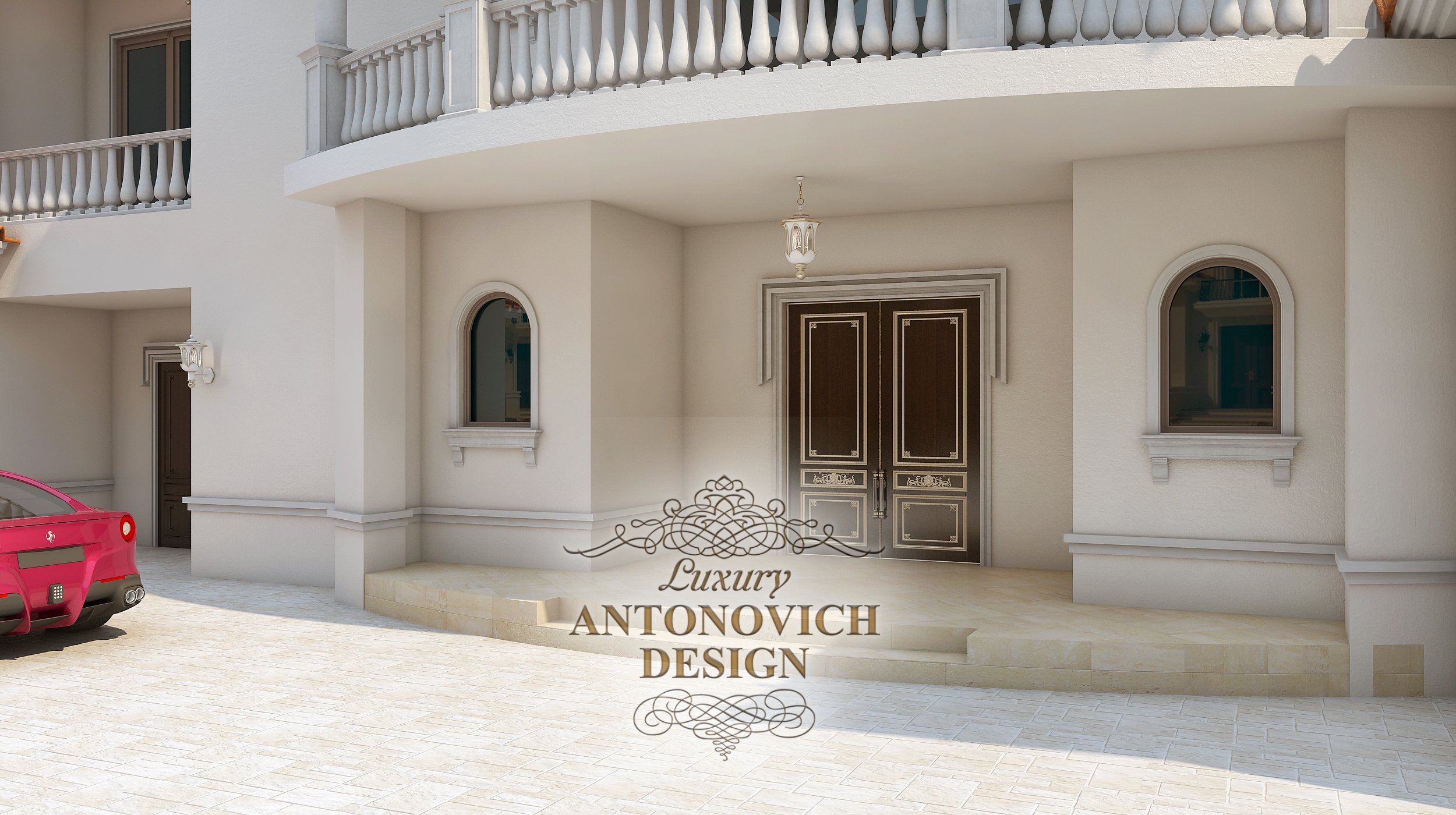 В проекте тщательно продумана каждая деталь. Вход в дом оформлен просто и с достоинством. Красивые двери из натурального дерева инкрустированы резным декором с позолотой. Небольшие арочные окна симметрично украсили входной портал. Пышность и торжественность экстерьеру придает балюстрада с классическими поручнями и балясинами.