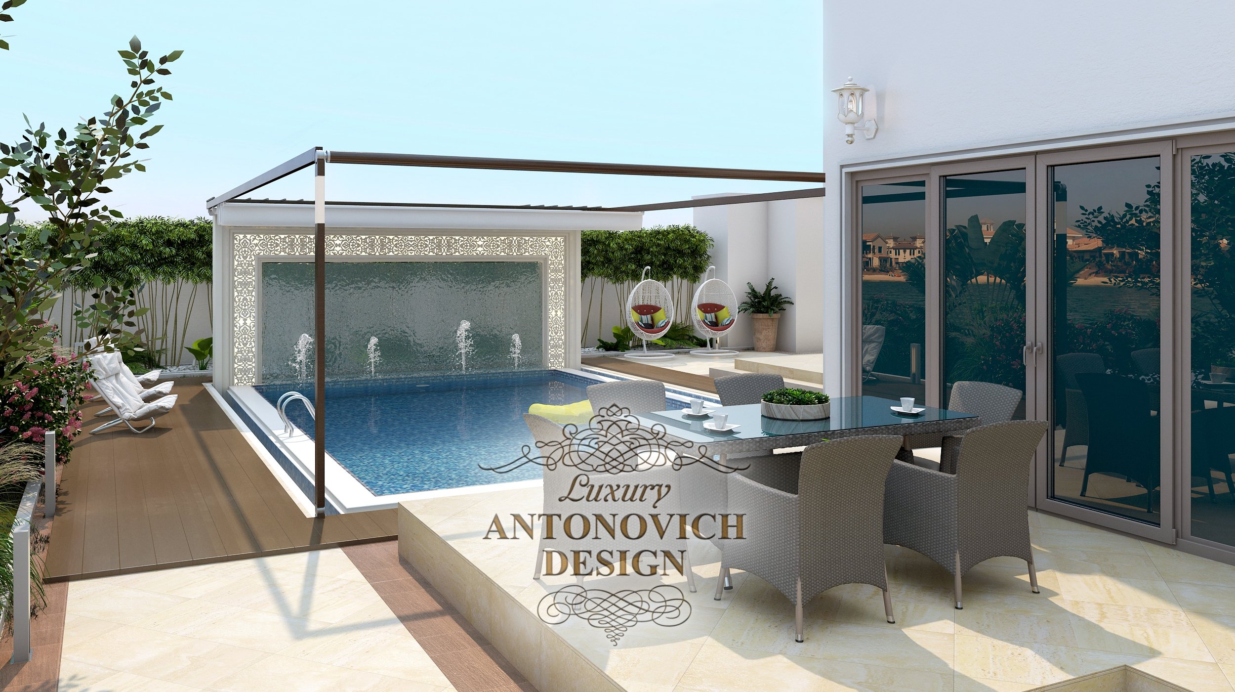 Если снаружи здания экстерьер приобрел более торжественные нотки, то его внутренняя часть посвящена уютному отдыху вдали от чужих глаз. Здесь архитектор объединяет романтичные нотки итальянских двориков, мотивы Древней Греции и средиземноморского пейзажа. Приятная глазу картина дополнена предметами мягкой мебели для комфортных минут отдыха.