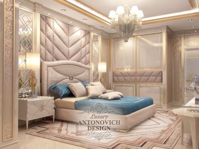 В интерьере спальни все продумано для того, чтобы отдых приносил исключительно наслаждение. Приятная гамма пастельных оттенков, красивая кровать, мягкие панели в декоре стен и шелковые обои. Все это обретает в работе дизайнера невероятно уютный образ интерьера роскошной спальни.