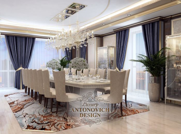 Достаточно большое пространство в апартаментах квартиры было выделено для зоны столовой. У больших панорамных окон, которые занавешены роскошными шторами из пепельно-синего шелка, расположен большой обеденный стол. Его окружают высокие мягкие стулья с благородной осанкой. Здесь могут с комфортом разместиться 18 человек, чтобы в роскошной обстановке наслаждаться трапезами и общением.