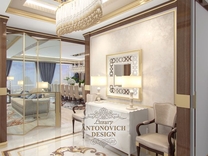 Традиционно для зонирования пространства дизайнер использует декор потолка. Он разделен на глубокие ниши с подсветкой и тонкими выразительными линиями латуни. Множество аккуратных хрустальных люстр в классическом стиле придают пространству квартиры торжественный и аристократичный лоск.