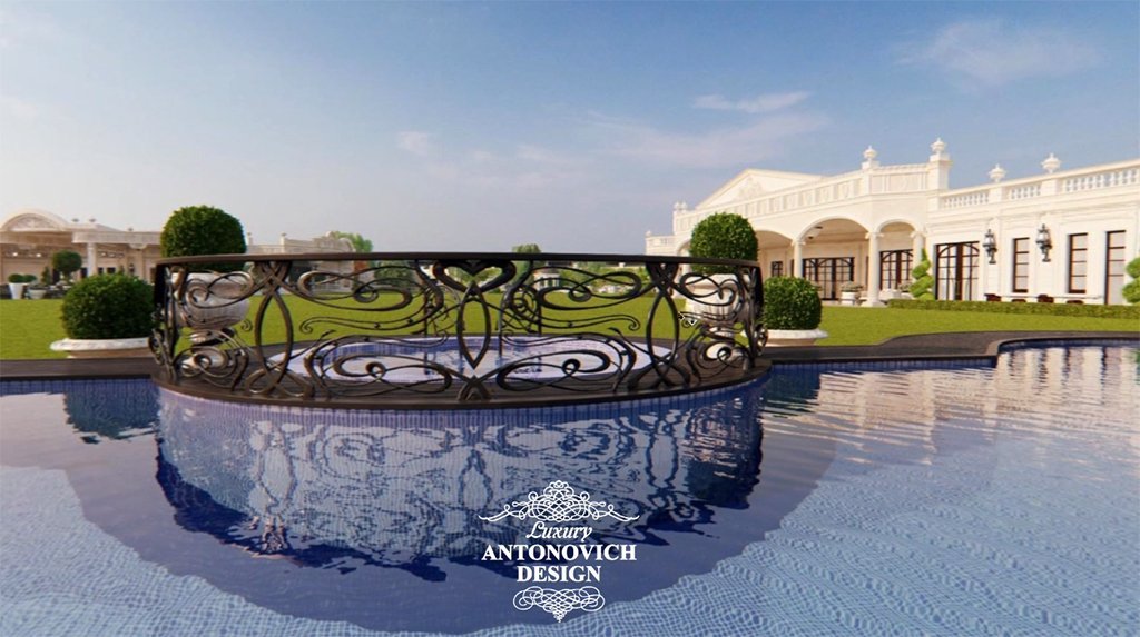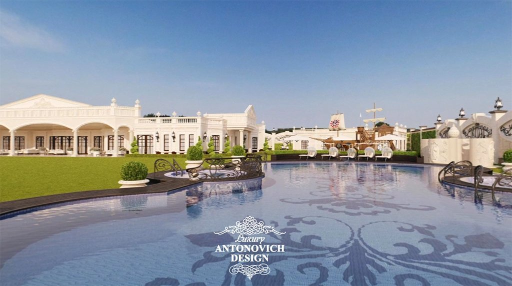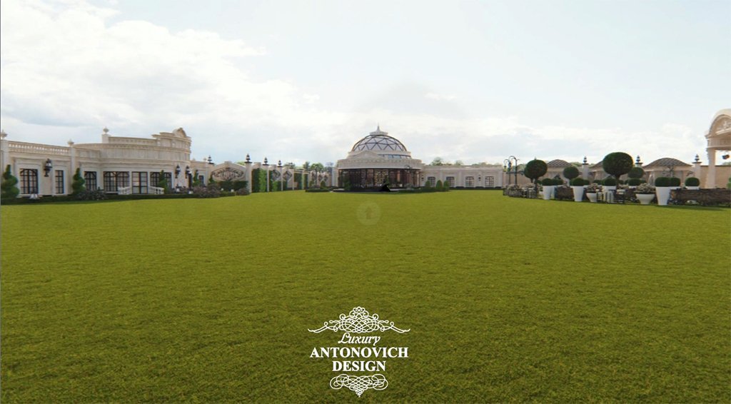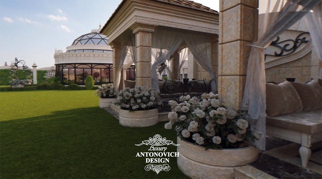 Особенностью данного проекта является то, что архитектурные формы в классическом стиле — галереи, павильоны, беседки, ротонда, барбекю, патио, оранжерея, выполненные в помпезном стиле, подчеркивающем их искусственное происхождение,— расположены по периметру участка, чтобы не загромождать пространство.