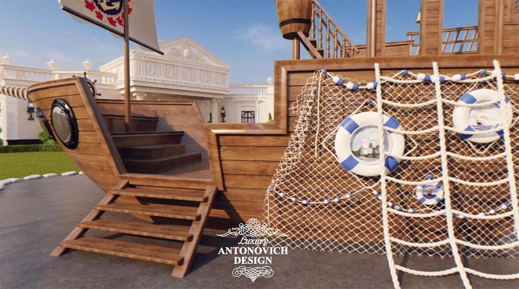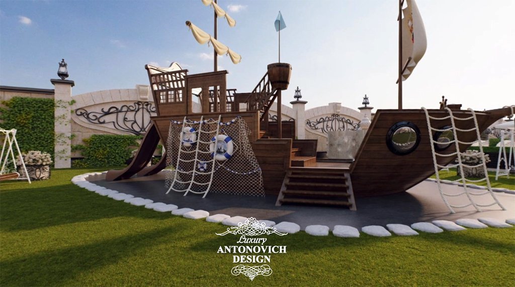 Зона отдыха возле бассейна имеет все атрибуты приятного времяпрепровождения. Водопад, джакузи, большое пространство для плавания позволяют в полной мере насладиться водными процедурами, а пространство возле бассейна — почувствовать себя в удобных шезлонгах на благородном курорте. Расположенные рядом качели и макет корабля позволят детям получить незабываемые развлечения и постоянно находиться в поле зрения родителей.