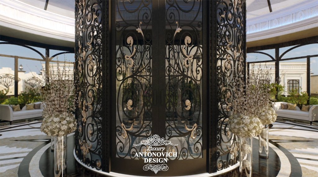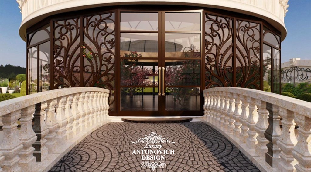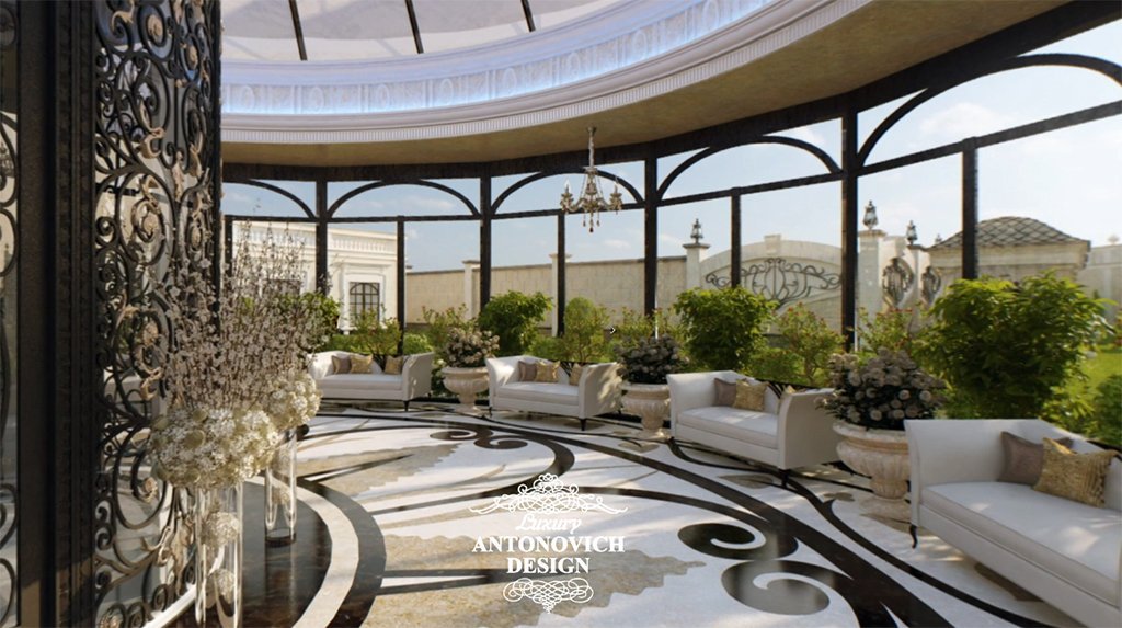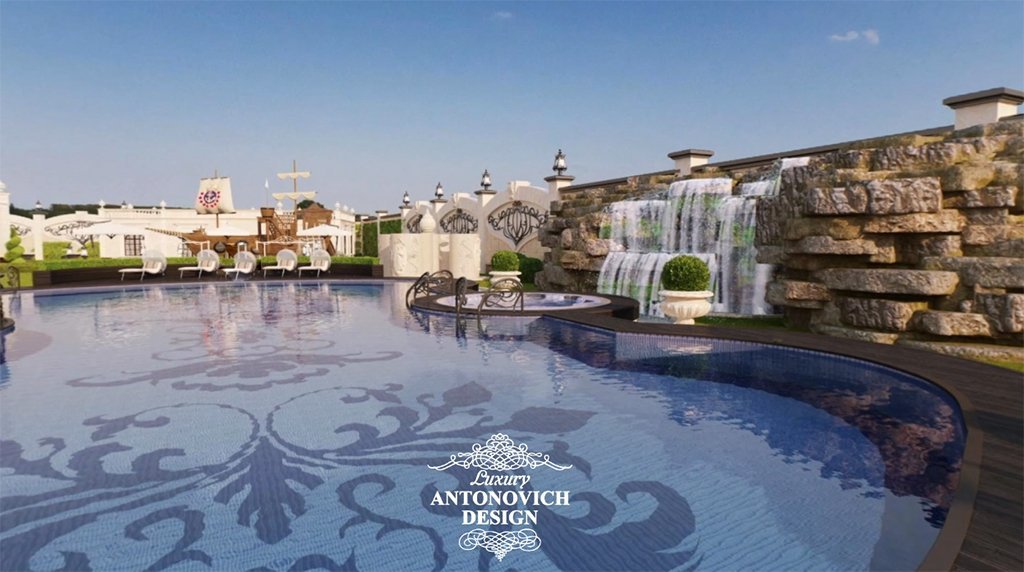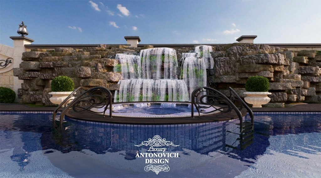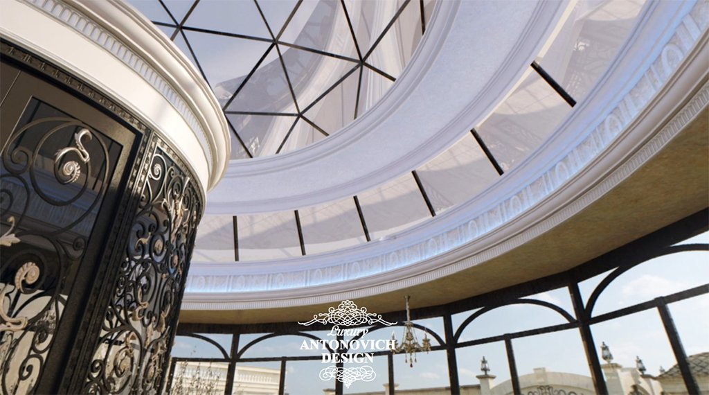 Особое внимание привлекает круглый павильон со стеклянным куполом в окружении водного бассейна по периметру. Внутри этого зимнего сада можно отдохнуть в уединении или в дружеской беседе, или обозревать окрестности, плавая на катамаране, наслаждаясь видом чудесного частного ландшафта, разработанного дизайнерами студии Antonovych Design.