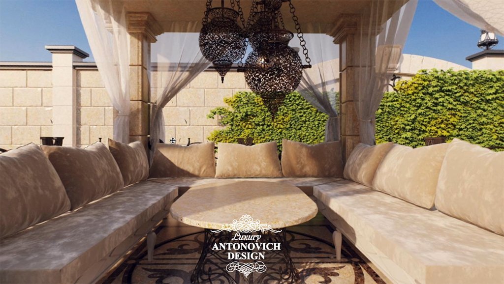Три античные беседки для отдыха освещаются экзотическими светильниками в марокканском стиле. Беседки имеют перила из фигурной ковки. Мягкие диваны и стол с мраморной столешницей и кованным подстольем позволяют окунуться в приятный отдых и погрузиться в чарующий аромат роз, высаженных в каменные вазоны у входа в беседки.