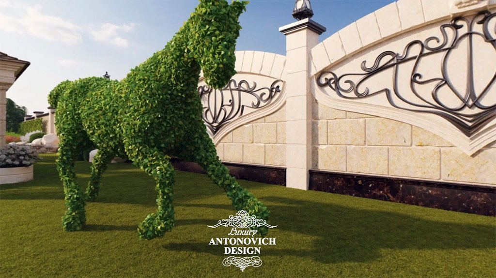 Лужайку, слева от центрального въезда украшают восхитительные скульптуры лошадей из живых деревьев. Форма создаётся с использованием каркасов, газона, лиан, топиарной стрижки.