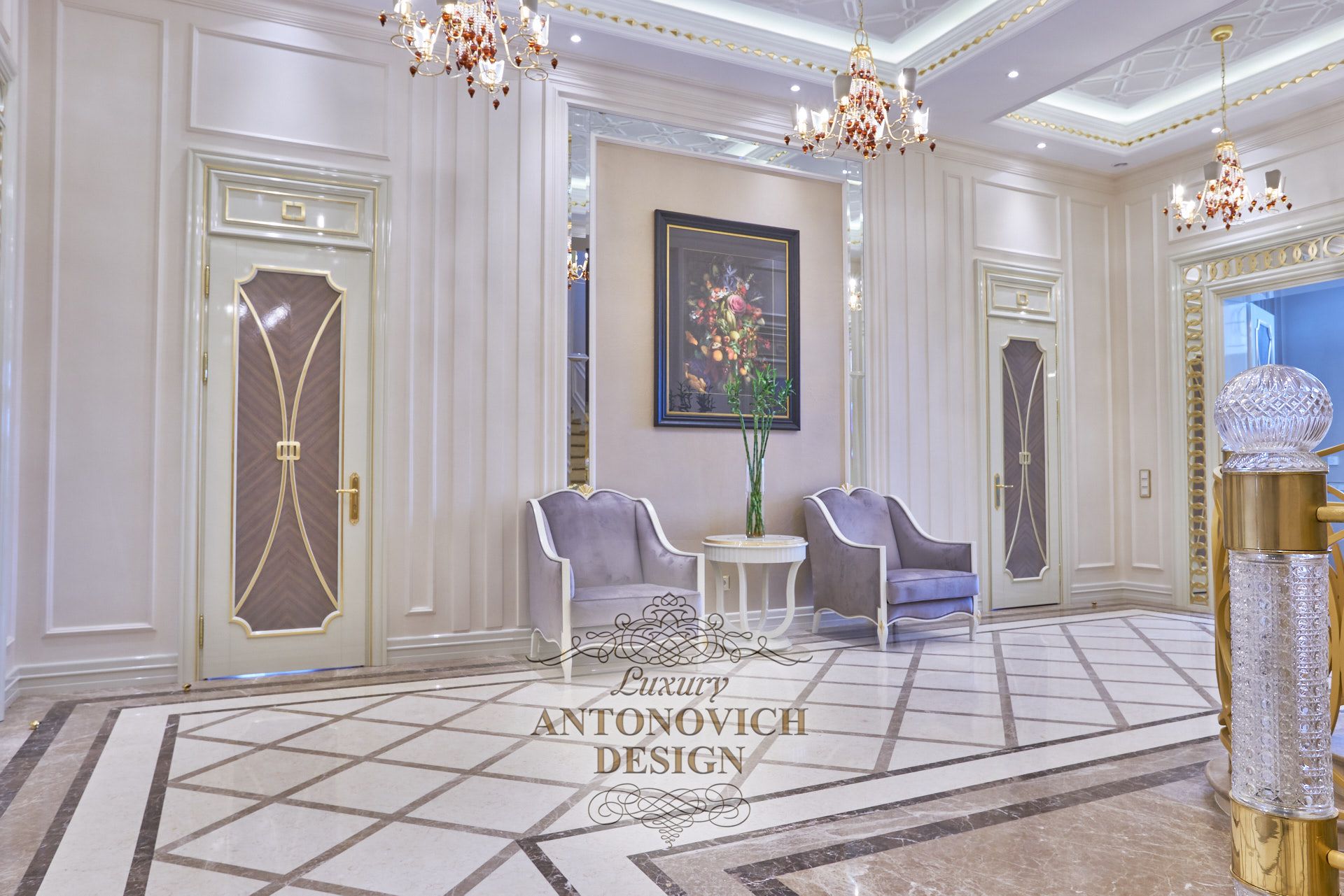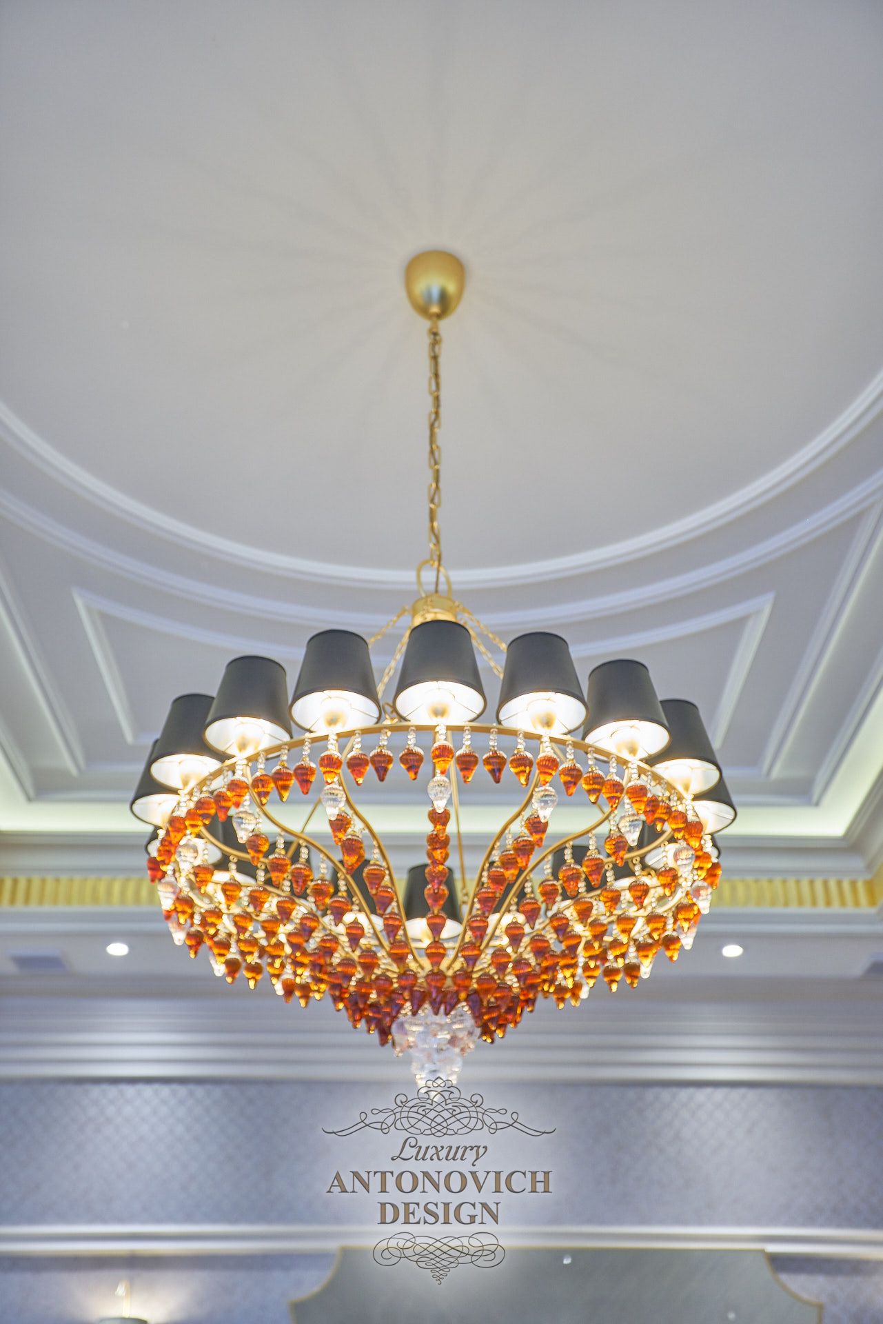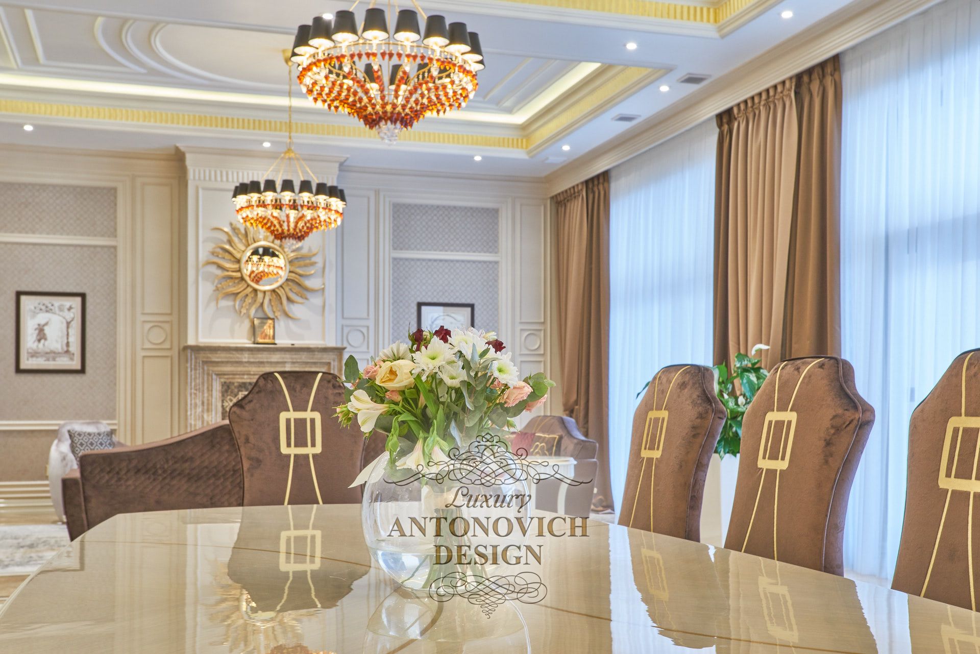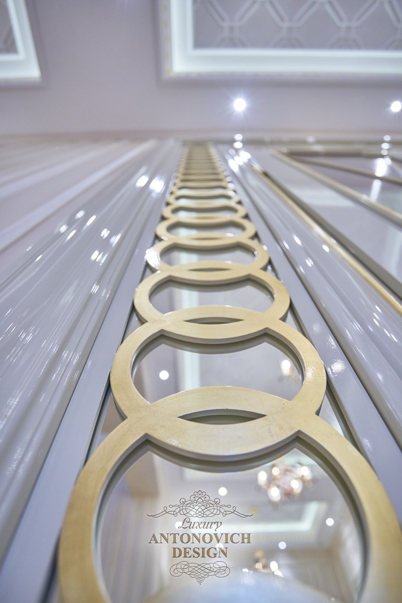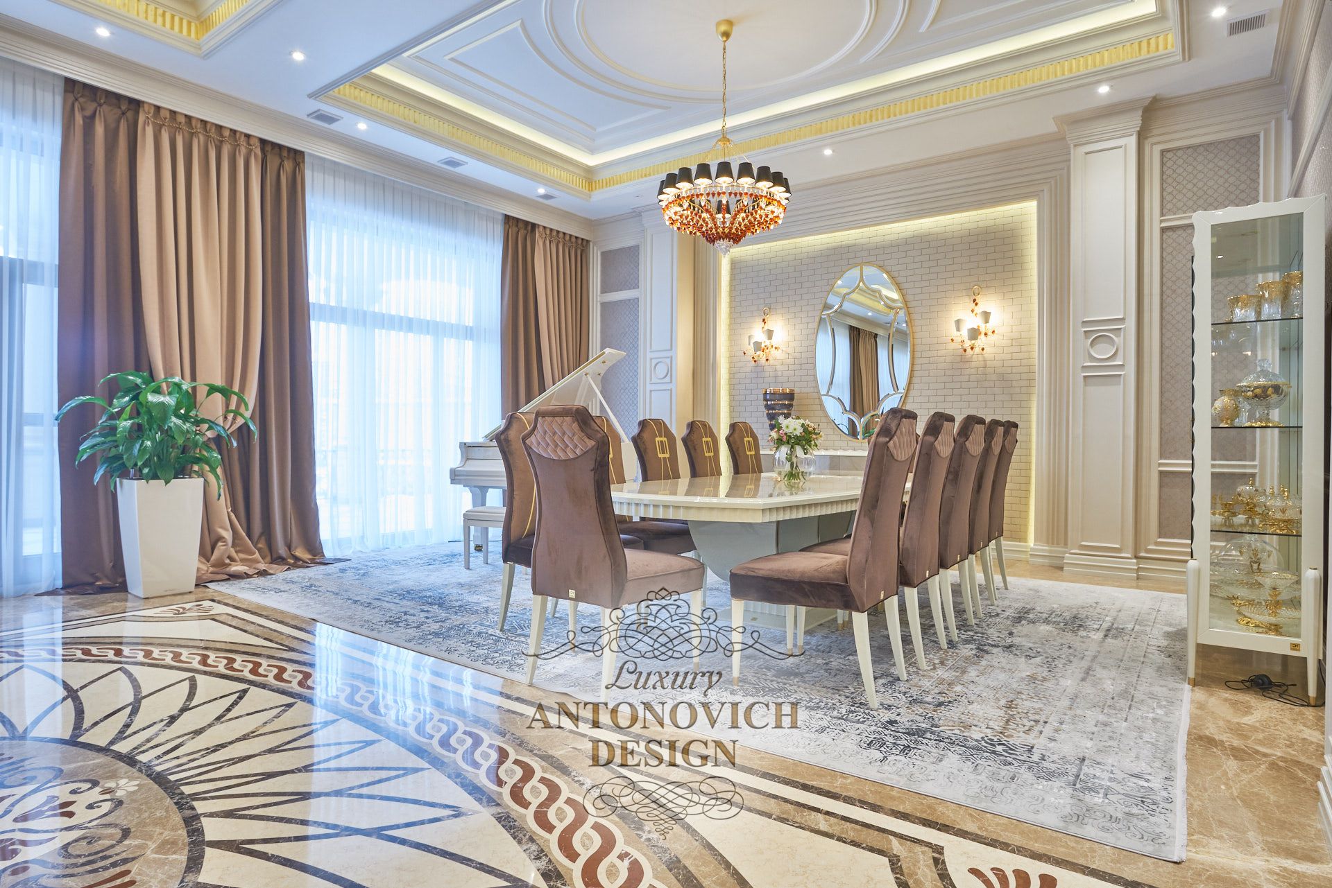Разнообразная декоративная отделка визуально подчеркнула неоклассический стиль интерьера: это и многоуровневый потолок с подсветкой по периметру и ромбовидной рельефной поверхностью, это и зеркальные панели с фацетом, которые вместе с молдингами, создают сложный ритм на стенах, это и двери, наличники которых декорированы позолоченным орнаментом, это и многорожковые люстры, медовые подвески которых, напоминают плоды фезалиса или китайские фонарики.