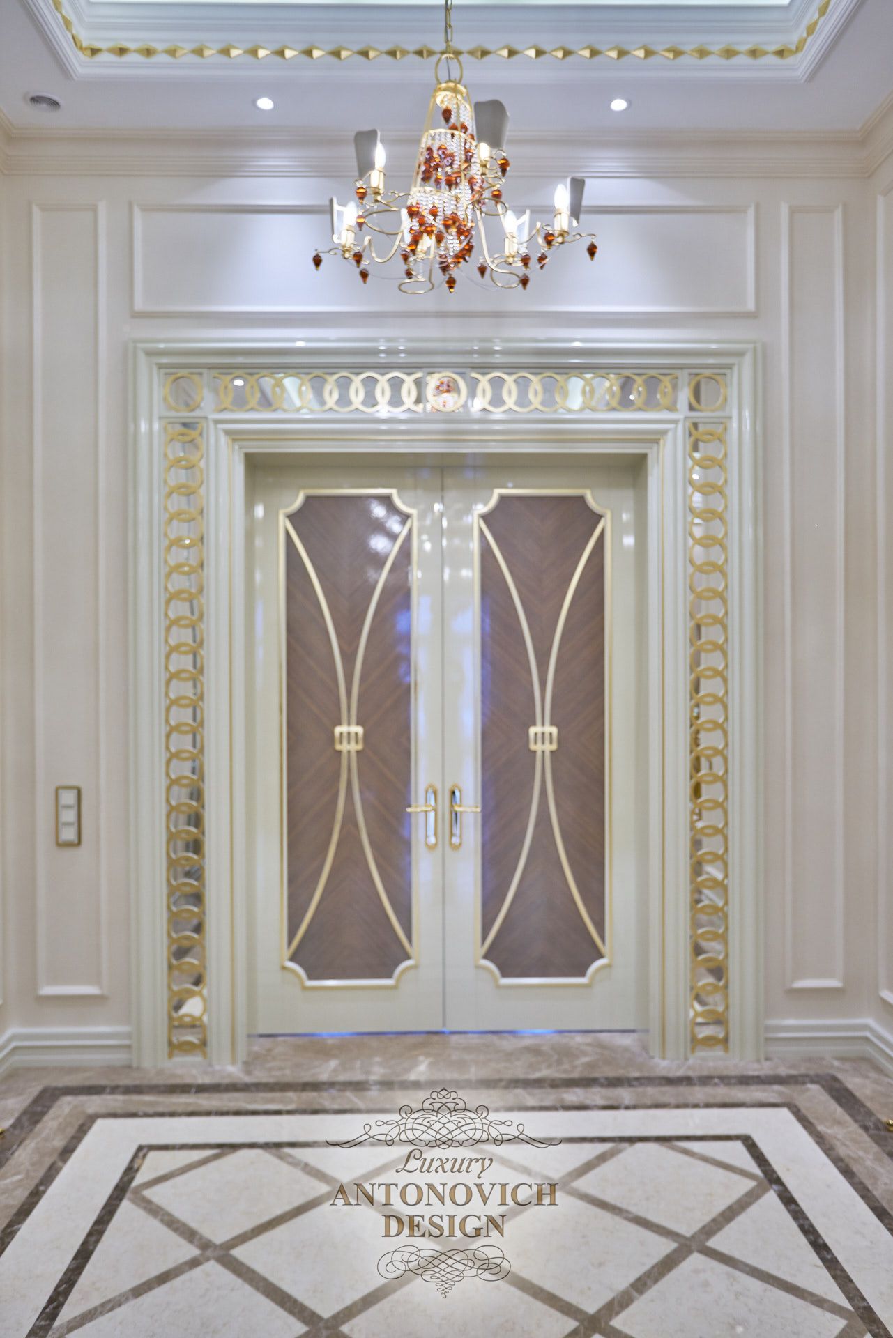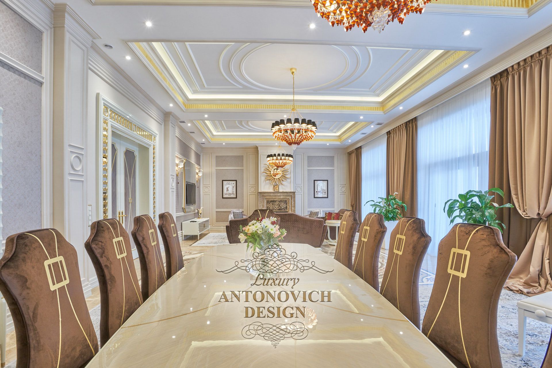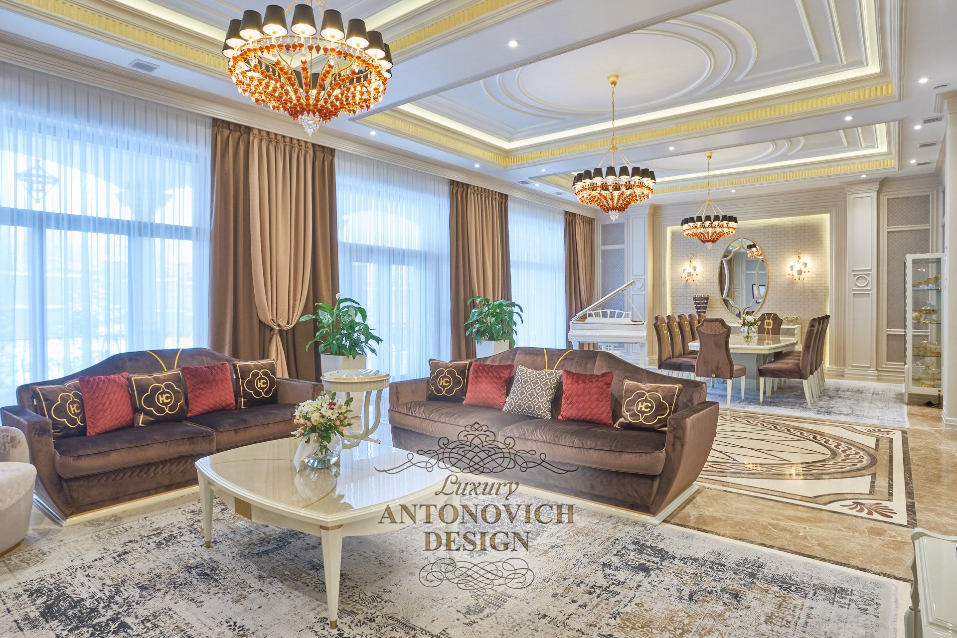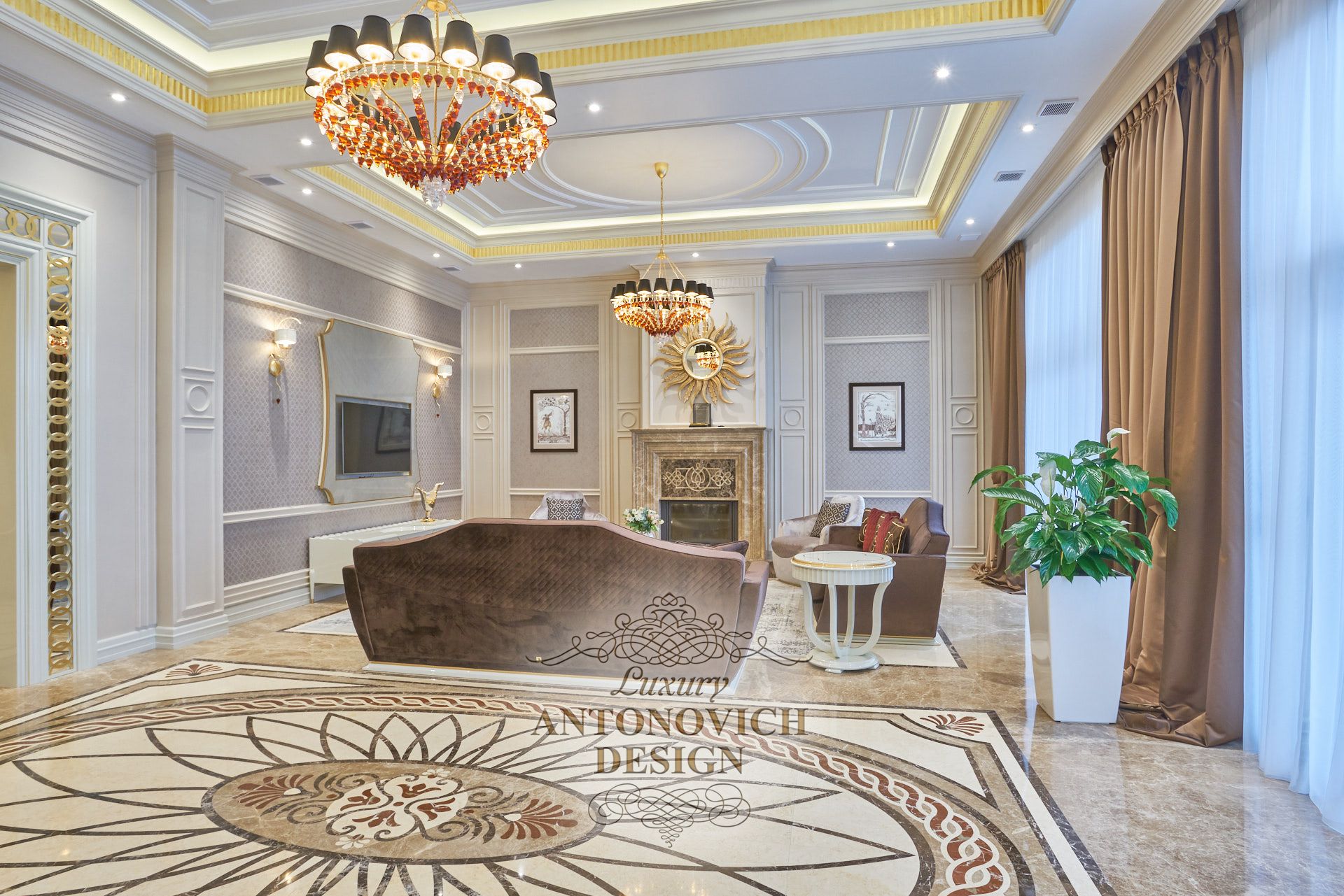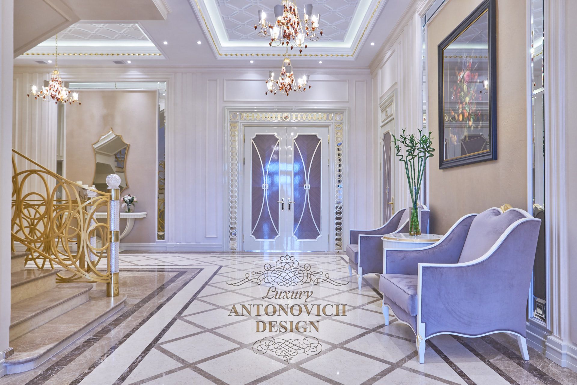 Разнообразная декоративная отделка визуально подчеркнула неоклассический стиль интерьера: это и многоуровневый потолок с подсветкой по периметру и ромбовидной рельефной поверхностью, это и зеркальные панели с фацетом, которые вместе с молдингами, создают сложный ритм на стенах, это и двери, наличники которых декорированы позолоченным орнаментом, это и многорожковые люстры, медовые подвески которых, напоминают плоды фезалиса или китайские фонарики.
