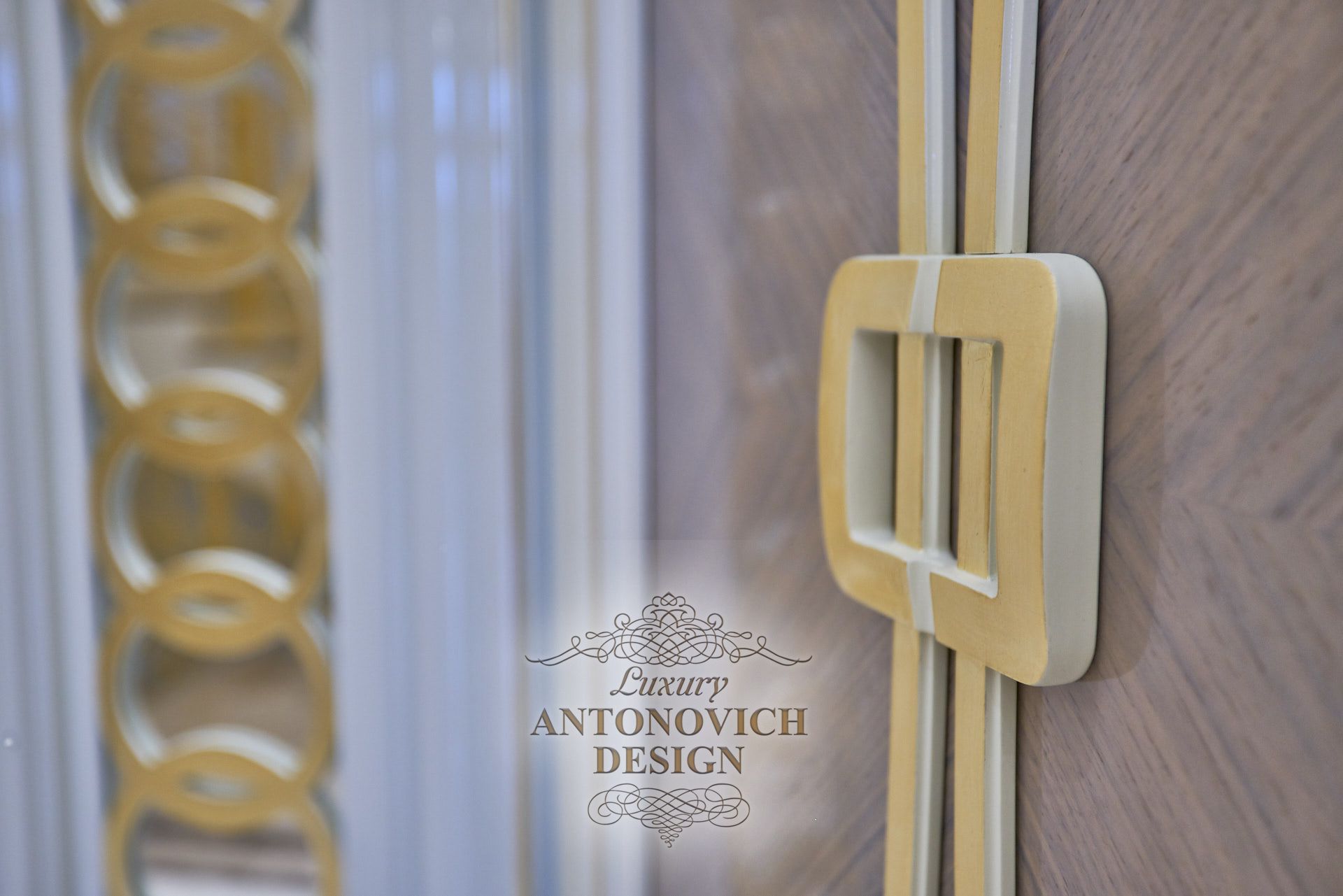 Великолепно обыгран в интерьере всего дома и гостиной в особенности брендовый паттерн Carpanese Home Italia в виде золотых дуг, перехваченных небольшим прямоугольником, напоминающим пряжку. Он читается не только на спинках стульев, но и в декоре дверей.