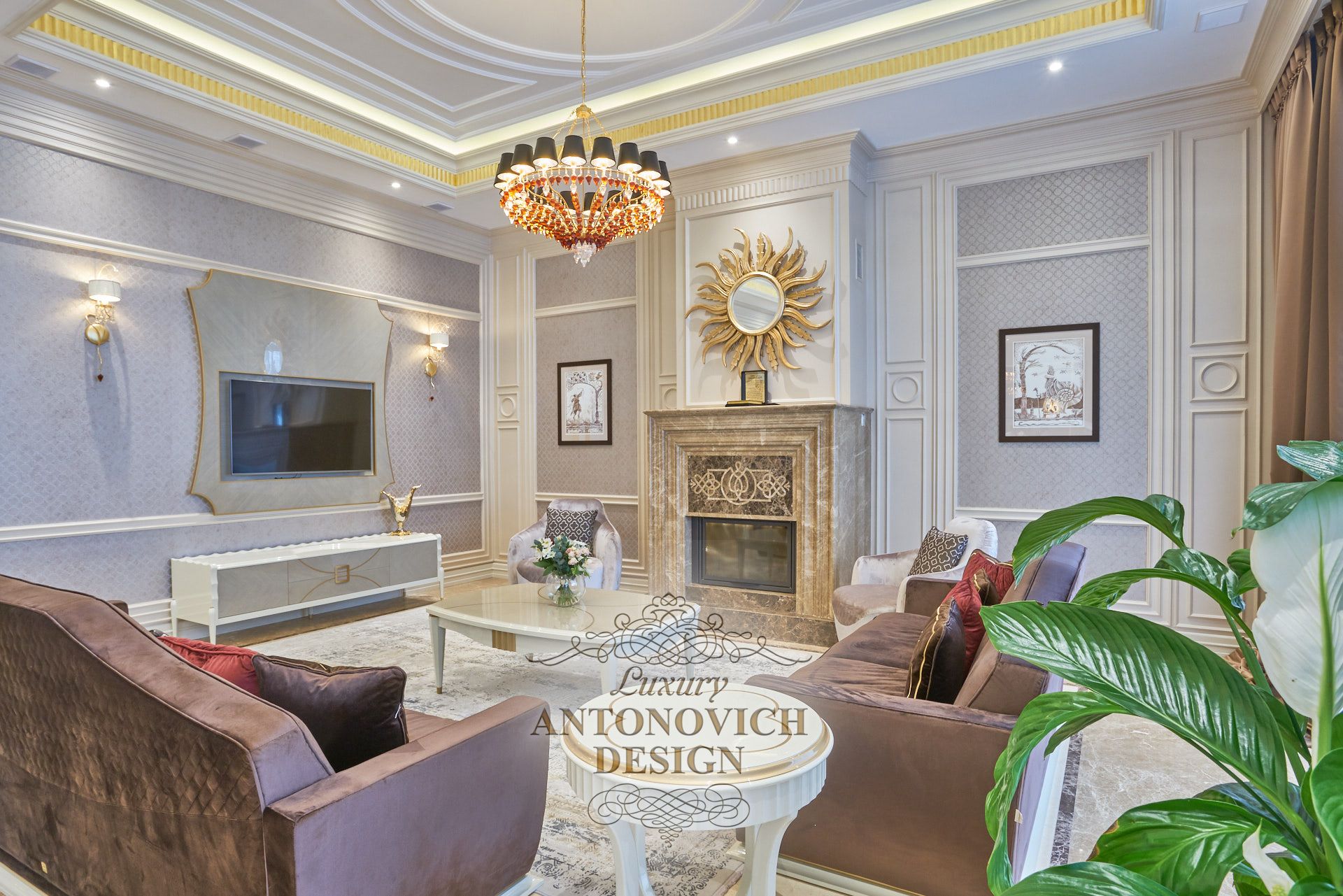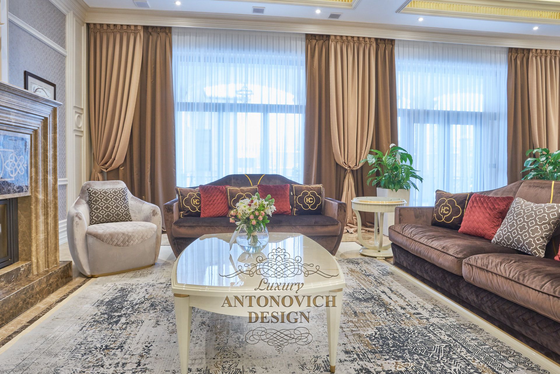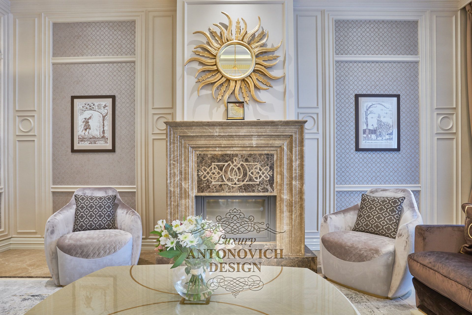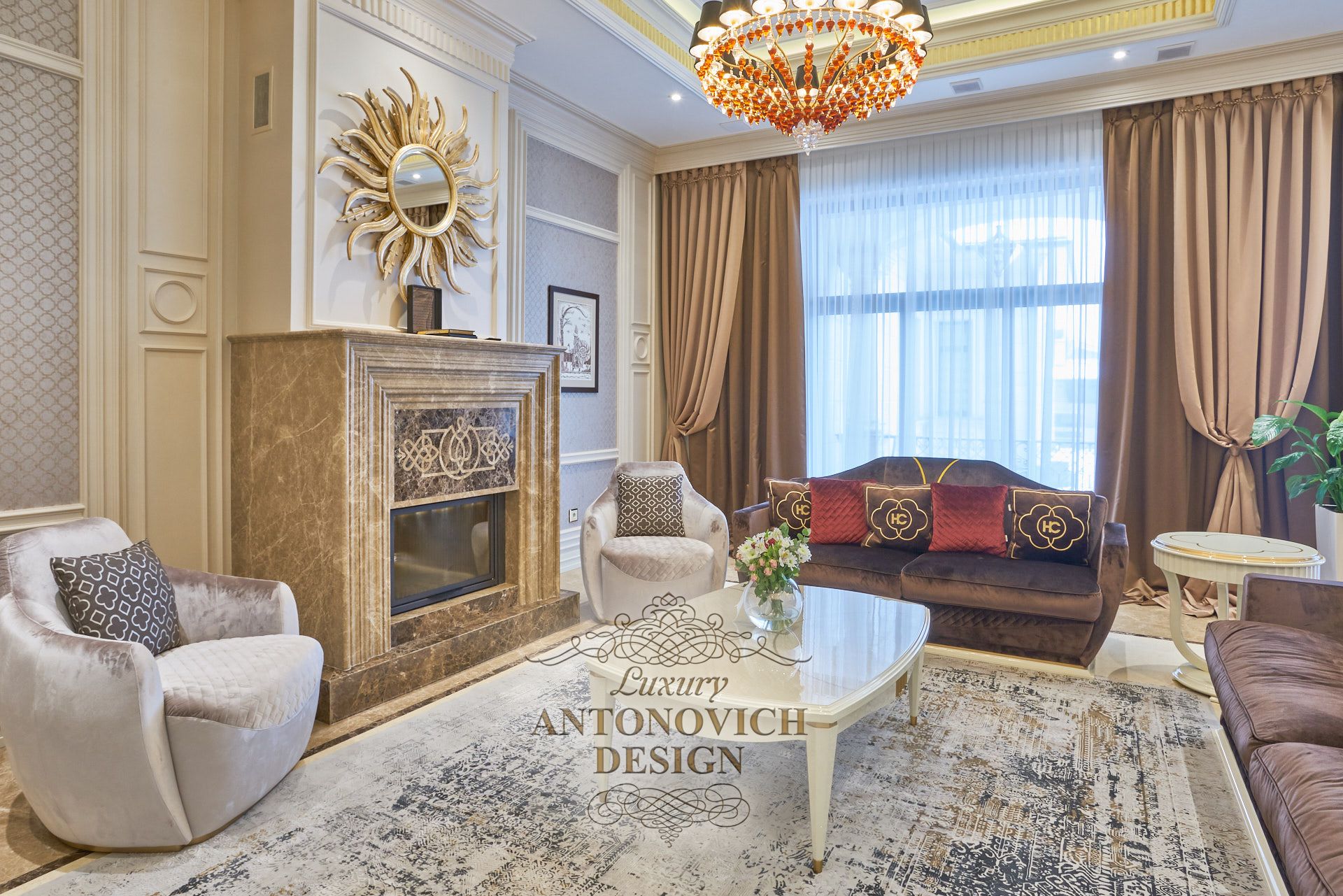 Смысловым центром гостиной стал камин в неоклассическом стиле, облицованный мрамором Emperador Light и Dark.