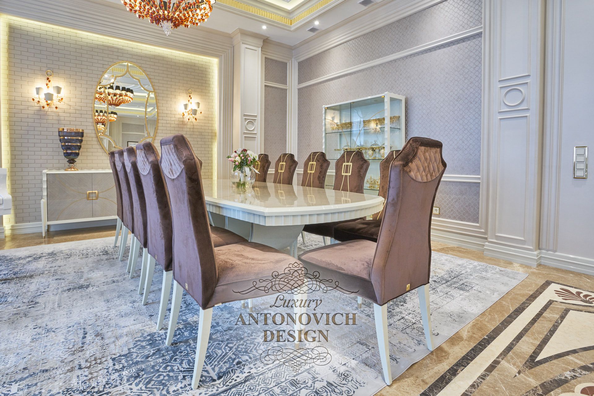 Столовая зона рассчитана на 12 человек. Основной акцент в этой части — стена, которая стилизована под кирпичную кладку, подчёркивая тем самым неоклассический стиль интерьера.