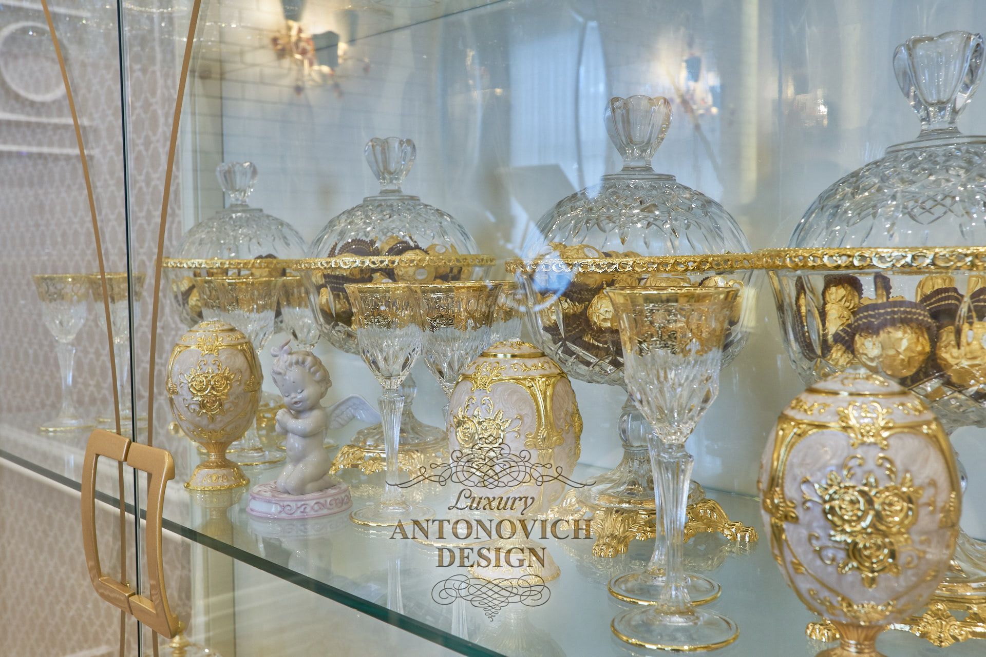 Глянцевые поверхности мебельных фасадов, золотые аксессуары в отделке мебели придают гламурное звучание и аристократический шик этому помещению.