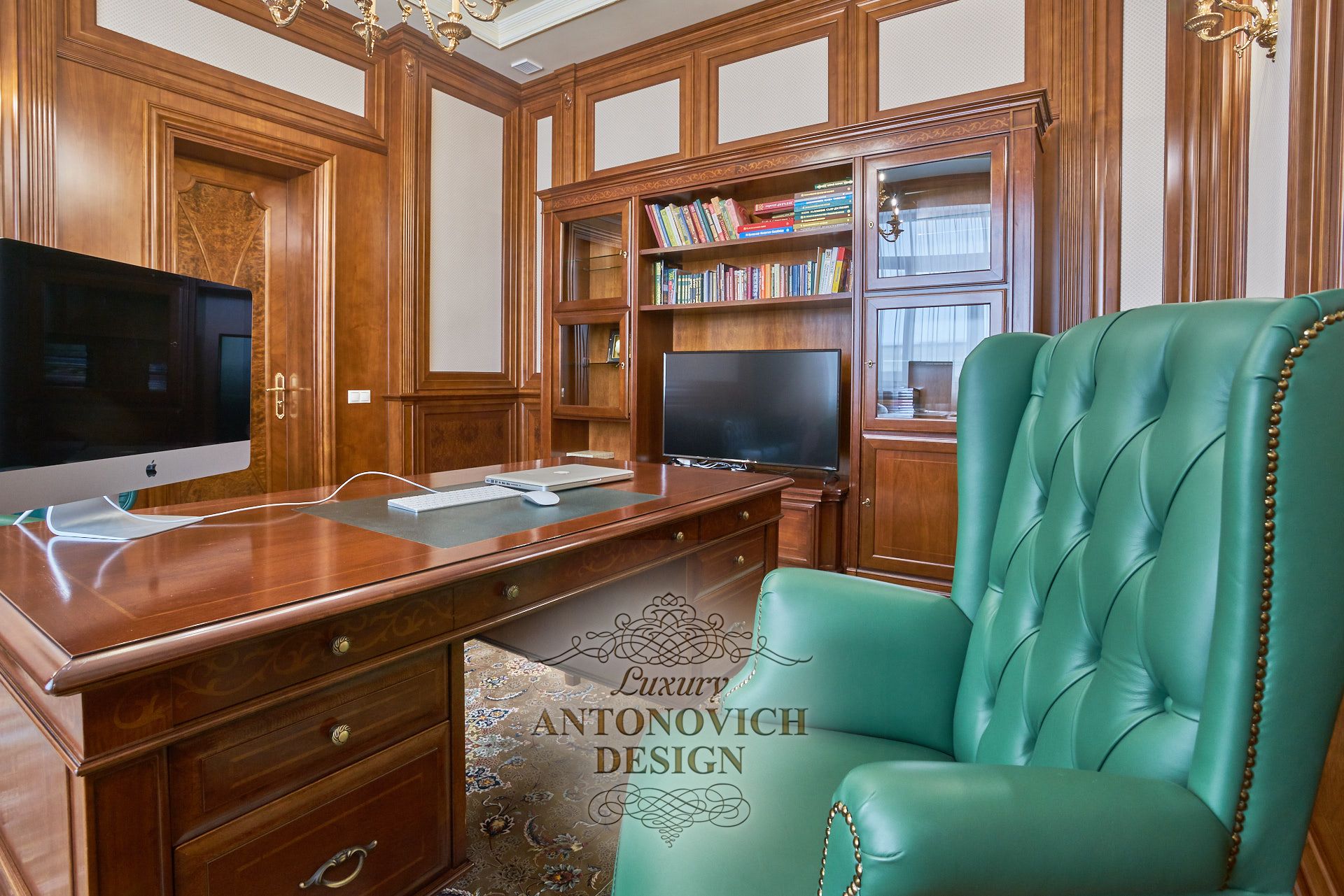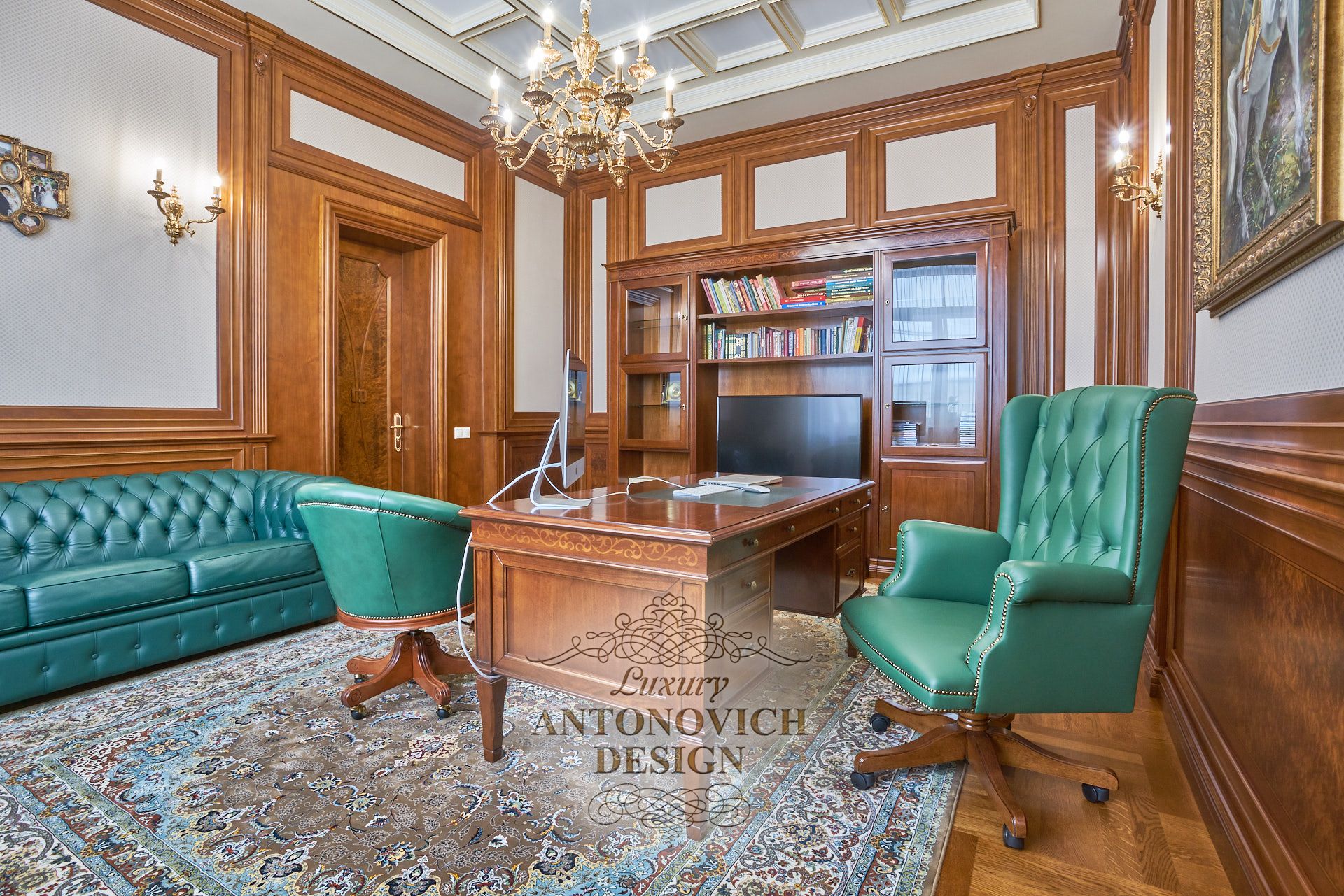 Кабинет отделан панелями из ореха. Изумрудного цвета кожаный диван модели Честерфилд, поворотное кресло, кресло для посетителя, письменный стол, книжный шкаф подчеркивают деловой стиль и демонстрируют статус и авторитет его хозяина.