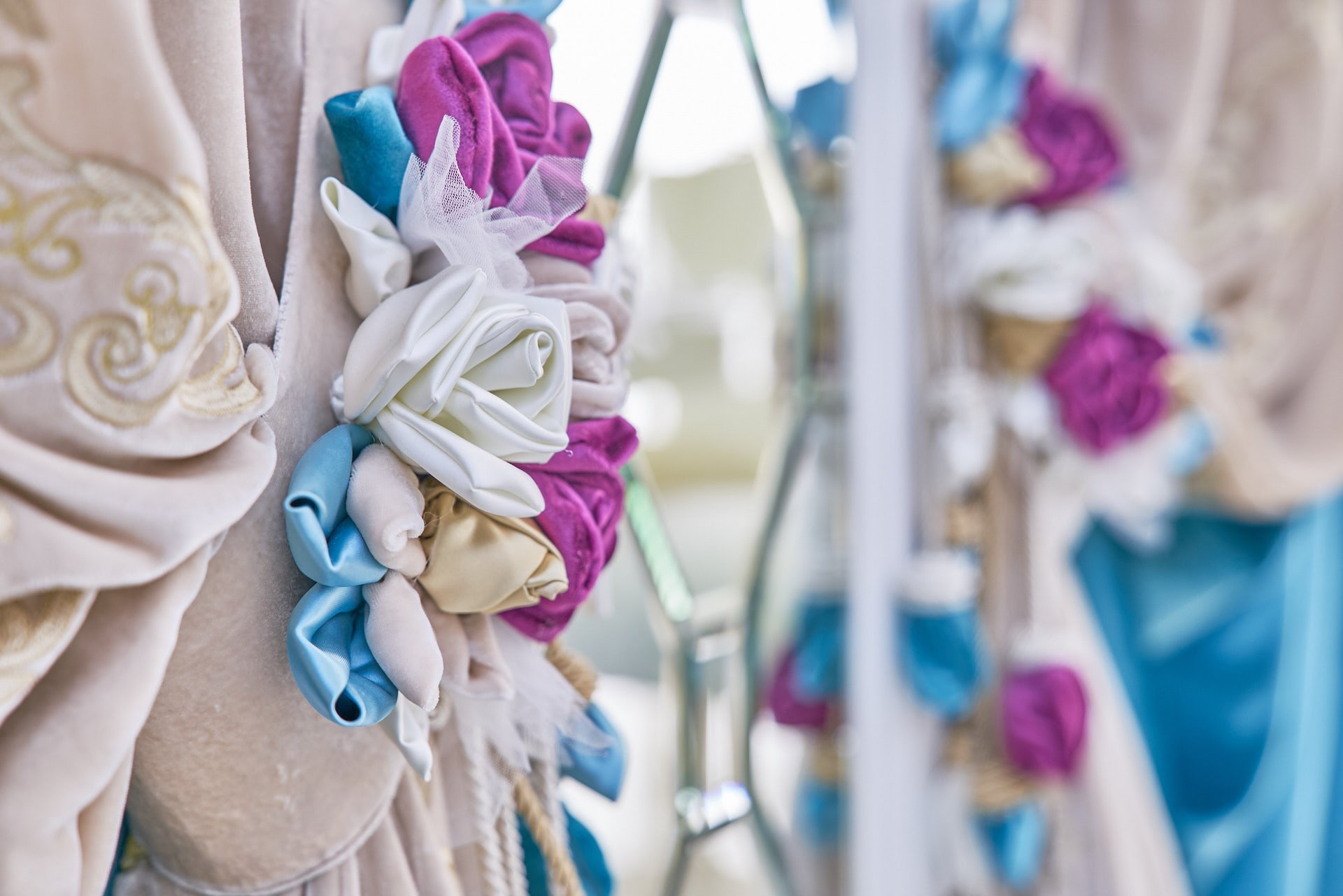 Тюль — панно «Принцесса Сиси» с аппликацией из шёлка. Изюминкой данной композиции стали подхваты ручной работы. Это букет цветов, который выполнен под заказ.