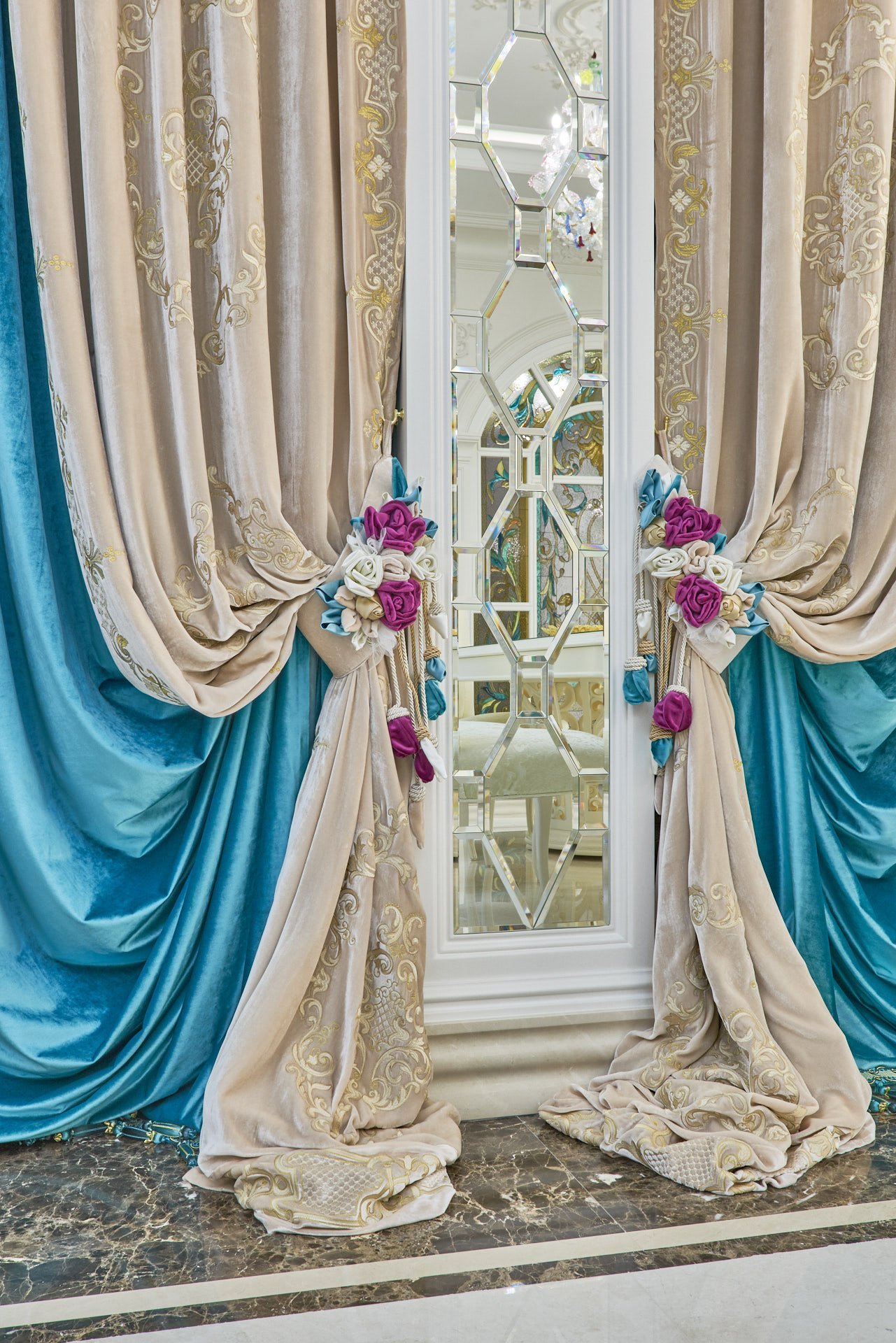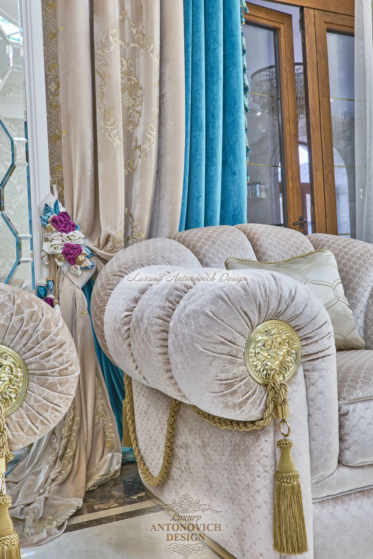 В гостиной 4 окна, которые декорированы двойными портьерами. Портьеры из бирюзового бархата служат в качестве функциональных штор, бежевая портьера — декоративная, с рисунком вышитым люрексом.