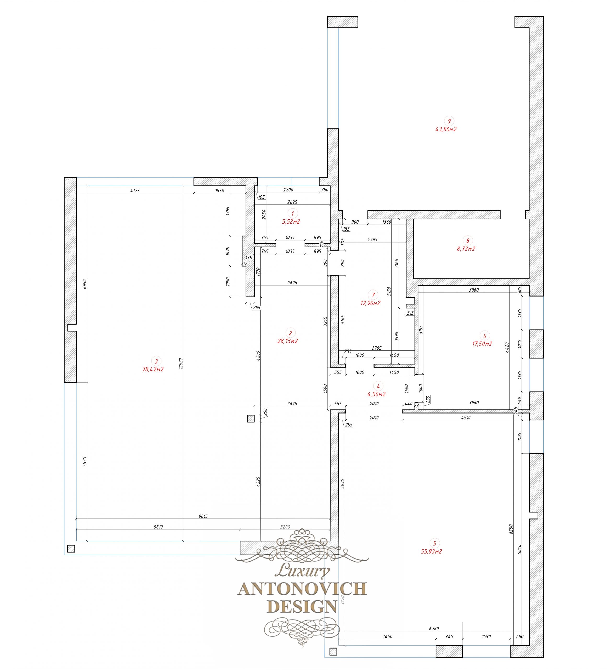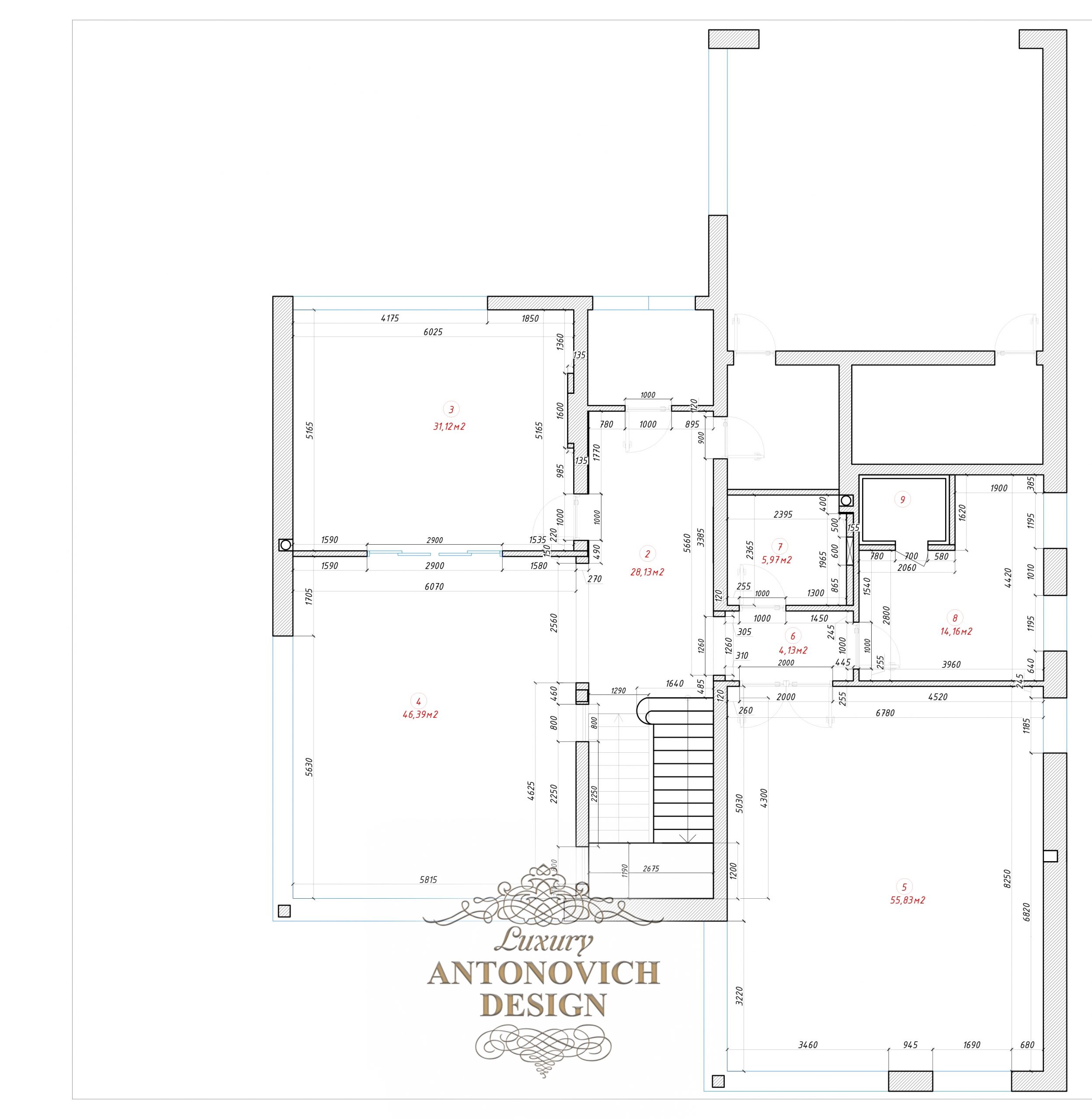 Достаточно большая площадь первого этажа дома, 243 кв. метра открыла возможности для перепланировки помещения в соответствии с целями дизайн проекта. Первоначально в этом объекте недвижимости находились помещения двух отдельных квартир, которые были изолированы друг от друга. С помощью решений архитекторов и проектировщиков с помощью перепланировки был организован холл с лестницей, ведущей на второй этаж.