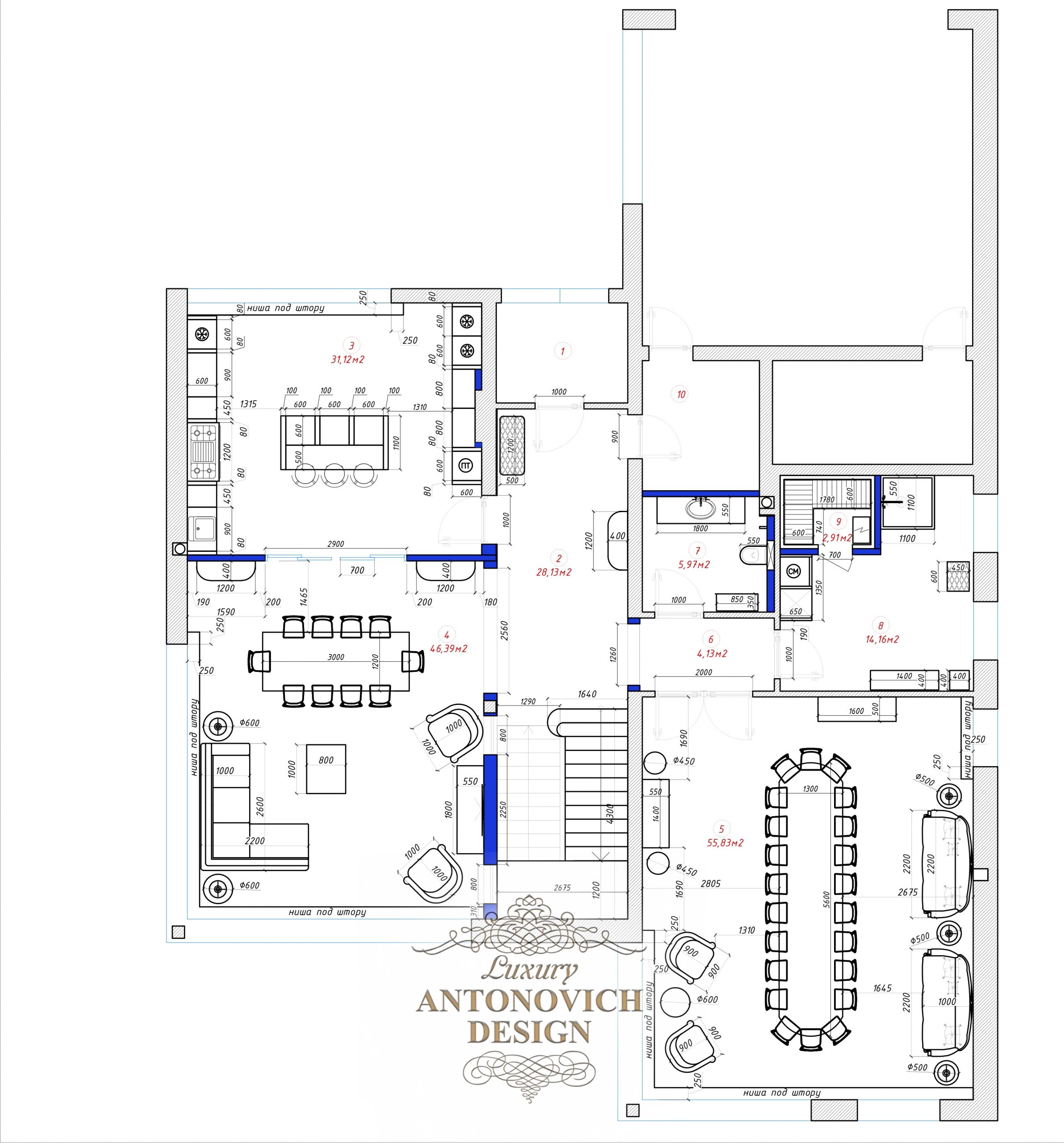 В этом проекте очень выразительным является момент гостеприимности и радушия владельцев дома. Об этом говорит большая столовая площадью 56 кв. метров с набором мебели на 22 персоны. Дополнительно столовой обустроена и роскошная гостиная.