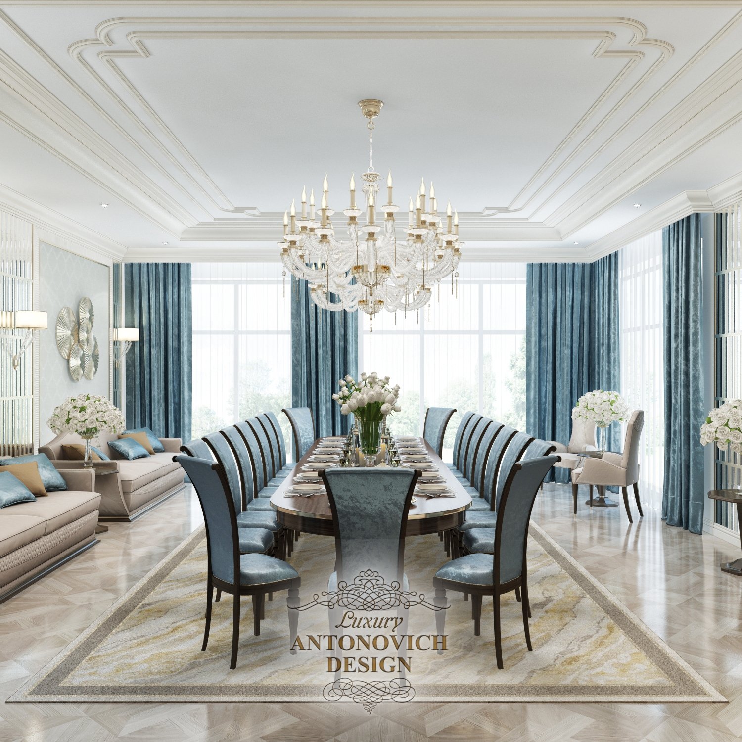 Большая столовая станет излюбленным местом для всей семьи и их гостей. Светлая и несколько прохладная гамма оттенков наполняет интерьер легкостью и свежестью. Чтобы дополниеть эти несколько прохладные акценты ощущением теплоты домашнего уюта, дизайнеры используют в декоре полов элитный паркет и натуральный светлый ковер. Две симметрично расположенные хрустальные люстры наполняют комнату блеском праздника и шика. В такой обстановке каждая трапеза, несомненно будет изысканной и торжественной. А гости ощутят, что в этом доме всегда им рады и готовы предоставить самое лучшее.