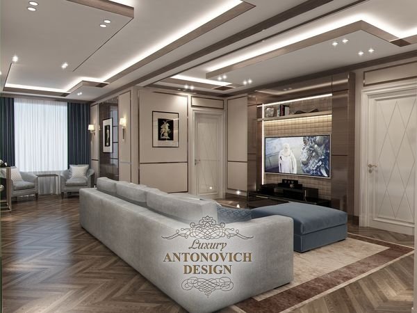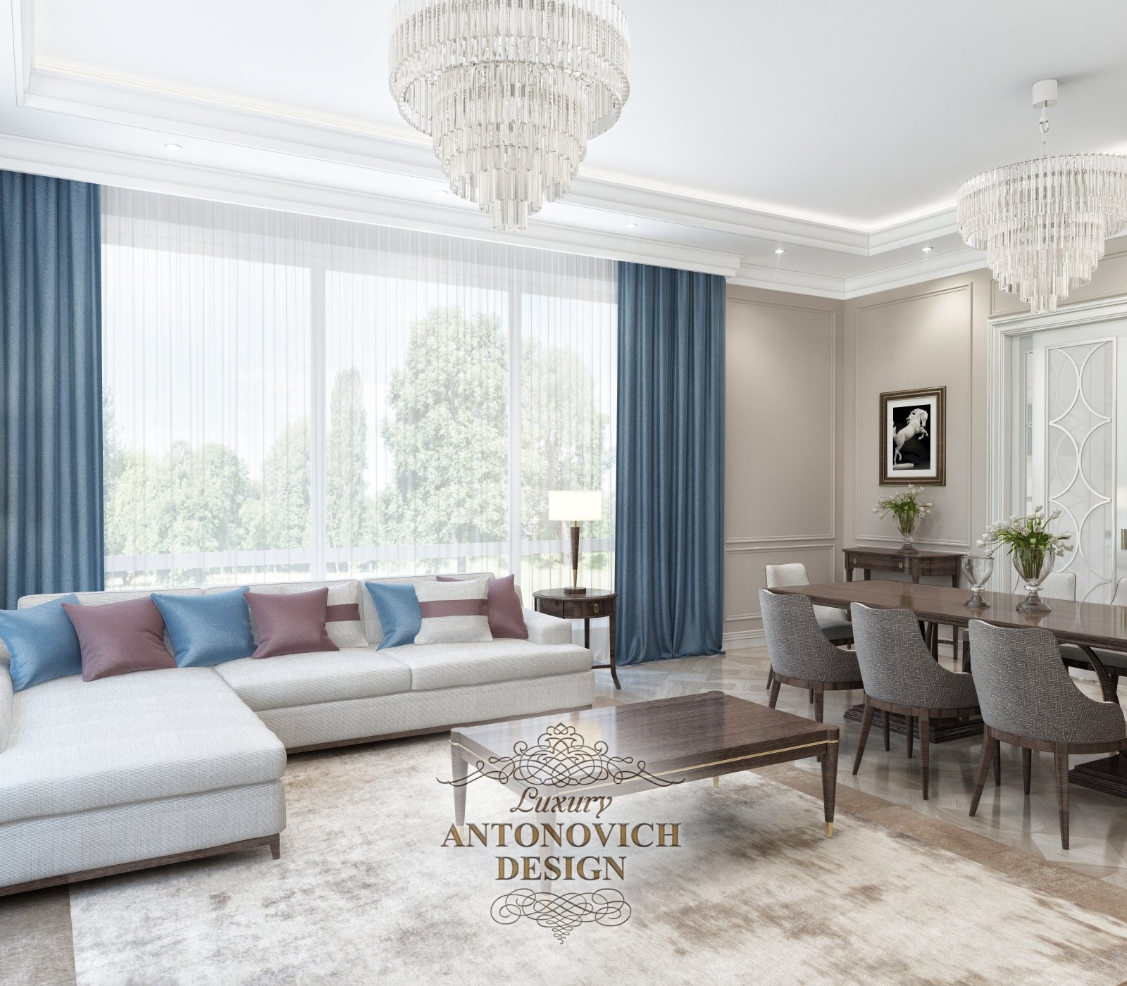Неоклассика в интерьере гостиной прекрасно отражает безупречный вкус владельцев дома. Здесь нет ничего лишнего, каждый предмет декора облагораживает пространство. Сдержанная палитра оттенков наполняет комнату элегантностью и благородством. Приглушенный серый оттенок стен выдвигает на первый план картины и стильную мебель из натурального дерева. Удачное расположение гостиной в помещении с большими панорамными окнами позволит любоваться красивым ландшафтным дизайном в изысканной обстановке. А в теплые и солнечные дни, прямо из гостиной, с помощью современных раздвижных систем оконного проема можно перешагнуть на открытую террасу с деревянным настилом и зоной барбекю. Каждый момент дизайнеры интерьера и архитекторы студии Antonovych Design предусмотрели для того, чтобы в этом доме было всегда комфортно и приятно находится. Чтобы домой всегда хотелось возвращаться. Ведь здесь царит тепло, уют и абсолютный комфорт.