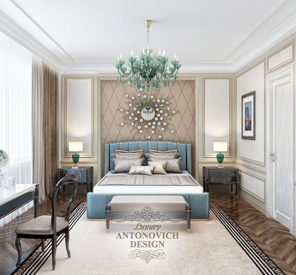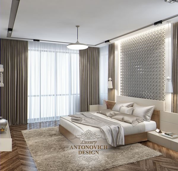 Родительская спальня выглядит элегантно и стильно. Сохраняя дизайн концепцию современной классики, авторы проекта добавили в интерьер легкие нотки праздничного ар деко с помощью декора стены за изголовьем кровати. Стильно смотрится сочетание темного паркета и светлого натурального ковра. Светлые стены плавно переходят в лаконичные фасады шкафов. Таким образом пространство не кажется загруженным, а, напротив, легким и непринужденным.