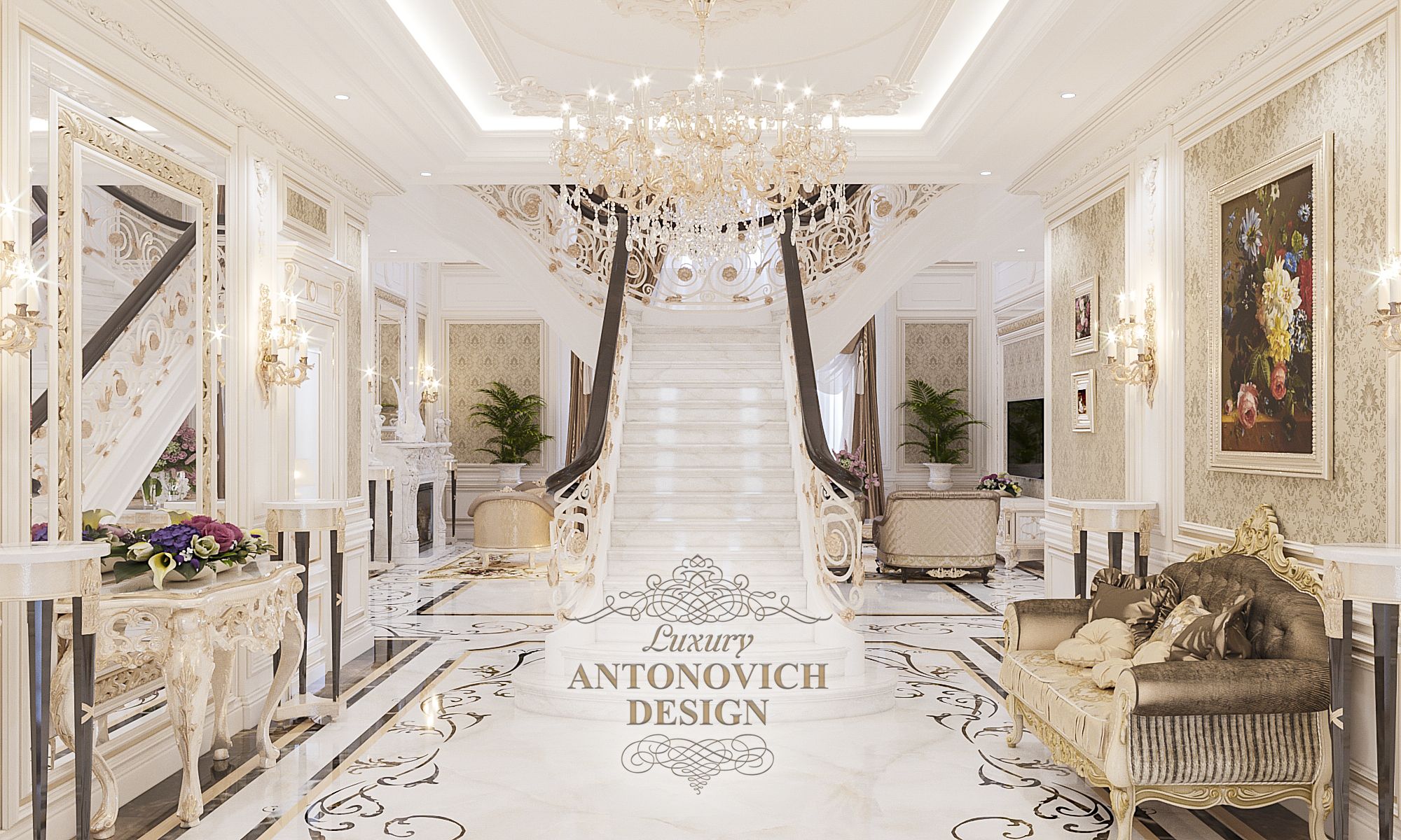 Вход в дом венчает нарядная белая кованная лестница с золотым декором.