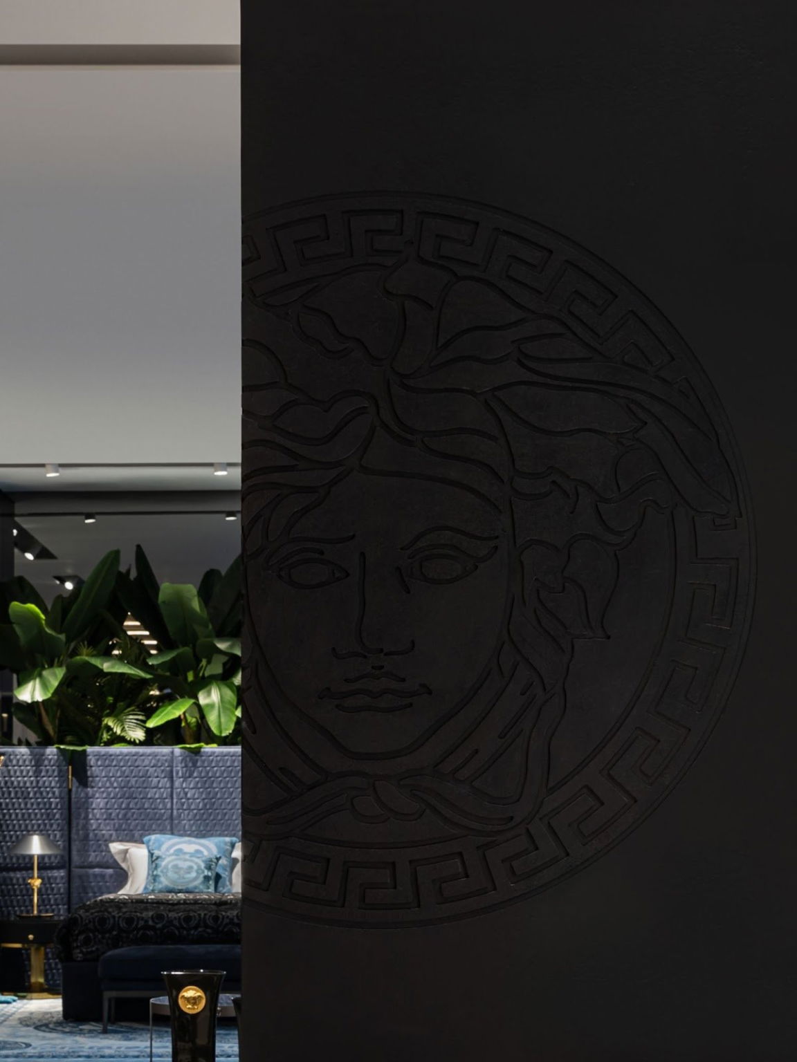 Когда дизайнерская команда Solomia во главе со Светланой Антонович приступила к разработке проекта, перед ними стояла амбициозная цель — не просто создать интерьер, а перенести философию Versace в архитектурное пространство. Это потребовало нестандартного мышления, поиска новых материалов и технологий, а также решения множества технических и бюрократических задач. Например, символ бренда — голова Медузы — был задуман как ключевой элемент потолочного декора, но его интеграция потребовала невероятной точности и внимания к деталям. В результате была создана огромная рельефная потолочная инсталляция головы Горгоны, которая сверху созерцает сквозь два этажа, подчеркивая мощь и величие бренда. Этот акцентный элемент — медальон Горгоны Медузы, символ бренда — эффектно выделен через второй свет, создавая мистическое ощущение присутствия древнего мифа в современном пространстве. Команда лично контролировала каждый этап производства, внося изменения до тех пор, пока результат не стал совершенным.