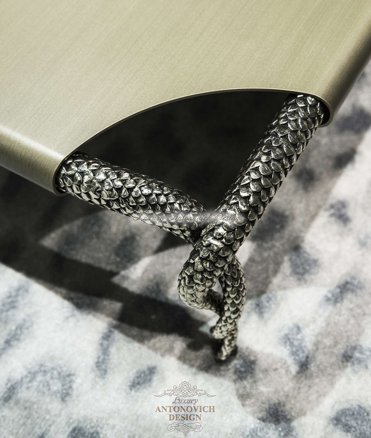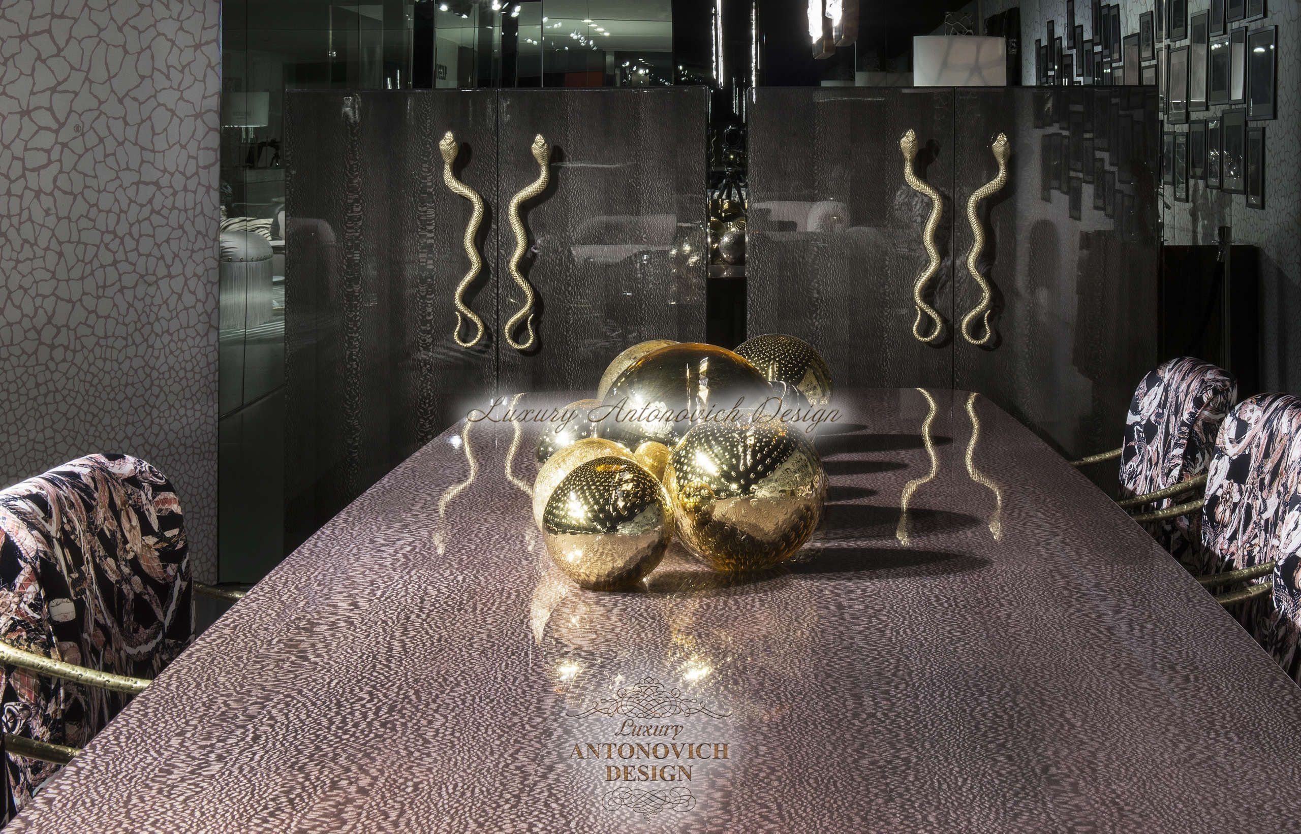 Оригинальное сочетание отделки и материалов способствует созданию впечатляющих предметов мебели, дополнительно украшенных присутствием змеиных ручек, воссоздающих подлинную идентичность Roberto Cavalli Home Interiors.