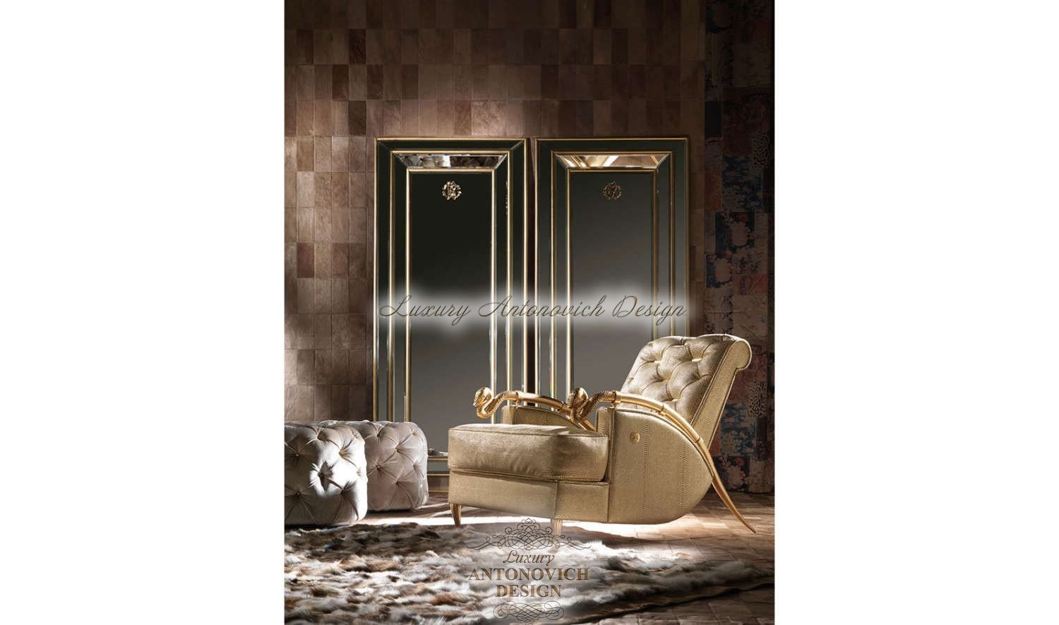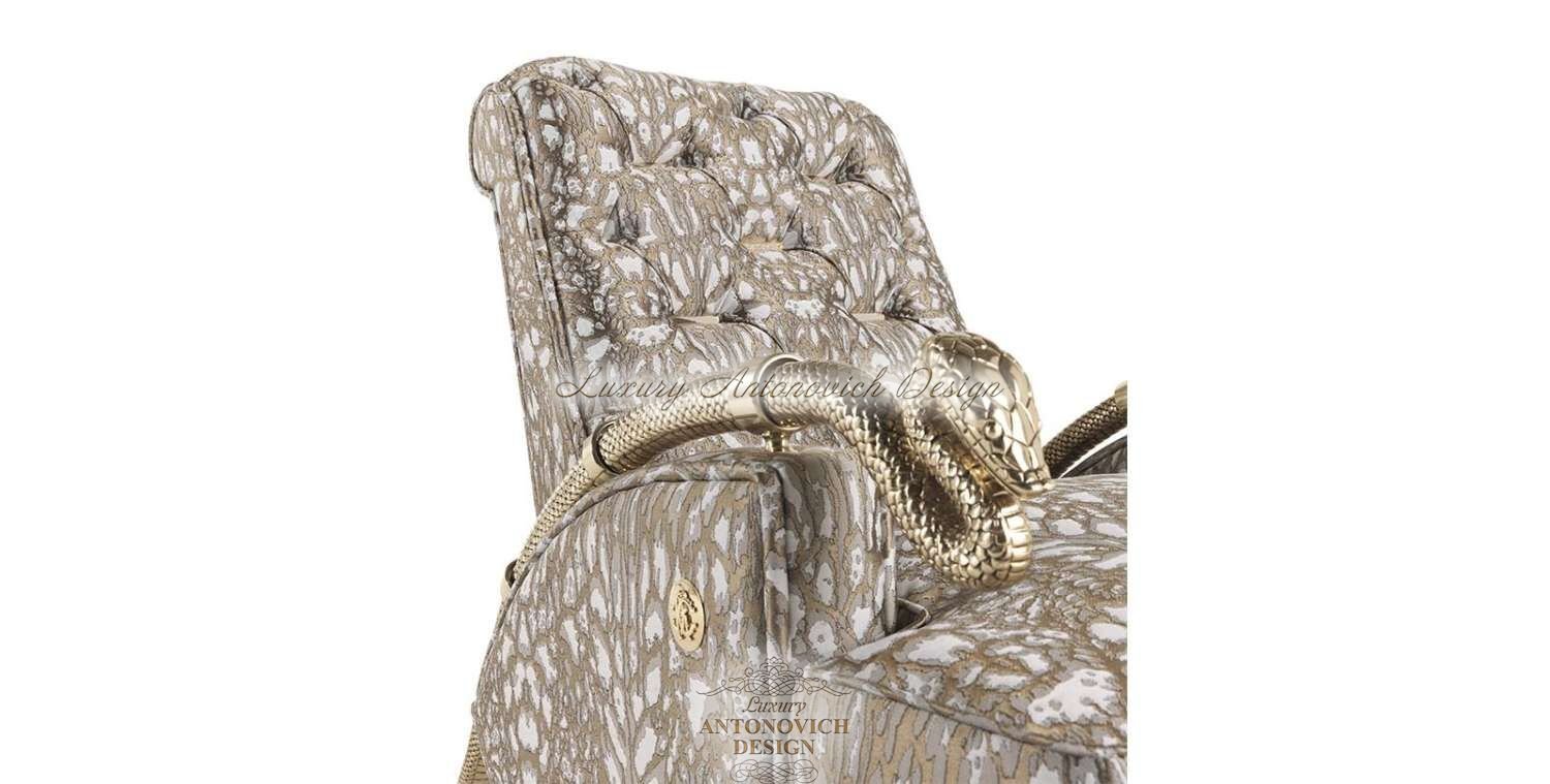 Латунные позолоченные подлокотники сразу заставляют нас вспоминать драгоценности Древнего Египта. Но формы кресел, их конструкция, безусловно, современные, небывалые. И никакой простоты, никаких компромиссов: натуральная кожа тончайшей выделки, золотые логотипы, мягкие подушки…